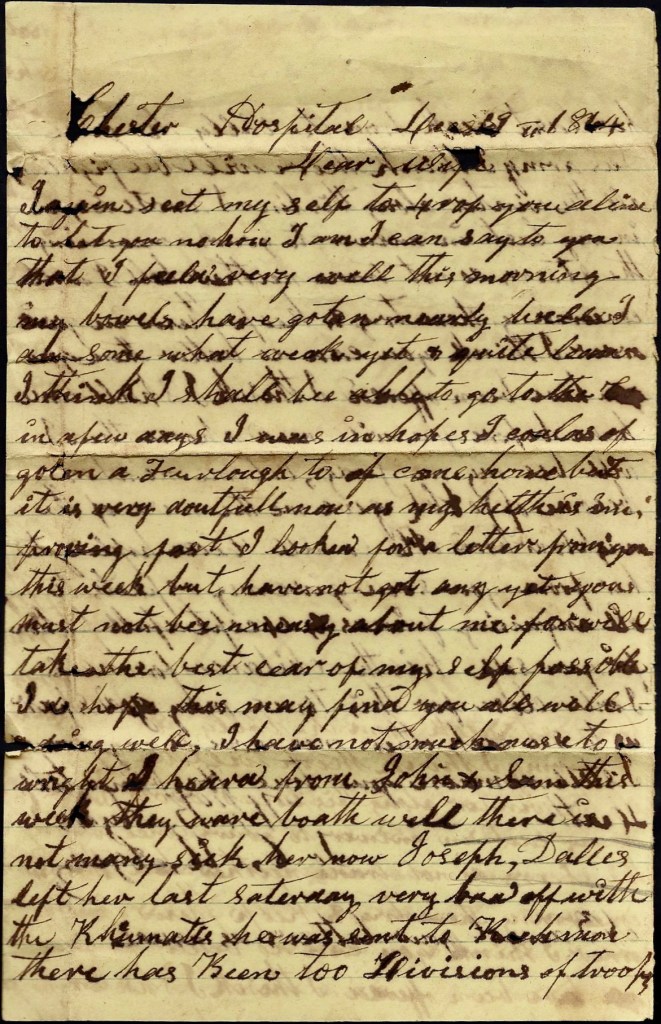 Dear wife, I do not want you to make your self uneasy about me. If I ever have the misfortune to never see you again. I hope you may be spared to have good health so you can raise our children [even] if we are run over with the Yanks. I hear the Yankees is up in Bedford [County] now. I am afraid they may come in to our neighborhood & destroy all you have to live on though I hope they may be drove back from there.