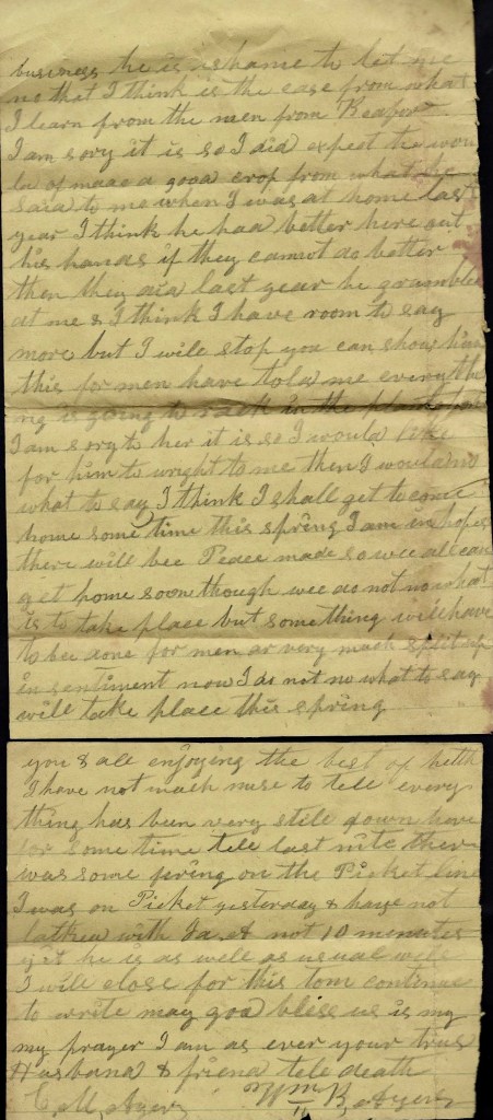 There has been some very heavy shelling over towards Petersburg for the last two days. That does not sound much like peace. Well, Charl[lotte], you must not be uneasy about me. Try and do the best you can for yourself & children till I can come. I am in hopes [brother] Herse will write to me before he goes back. This leave me well as common. I am gaining in flesh very fast. The health of our company is very good now. You must excuse bad writing for my eyesight is so I cannot see to write. I guess I have said enough for this time as I said too much in my last. I want you to tell John I want him to not to forget to do what he promised he would do for me concerning a [ ]. Jas. & T is well. I have not heard from Cap yet [or] what he is doing. My love to you. Kiss the children for me. Give my respects to all. — Wm. B. Ayers