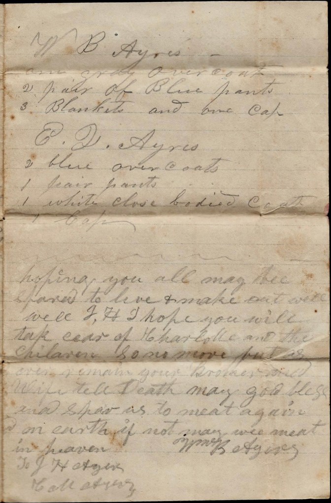 Well, J. H., I hope you will take care of Charlotte and the children. So no more but as ever, remain your brother and wife [husband] till death. May God bless and spare us to meet again on earth. If not, may we meet in heaven. — Wm. B. Ayers