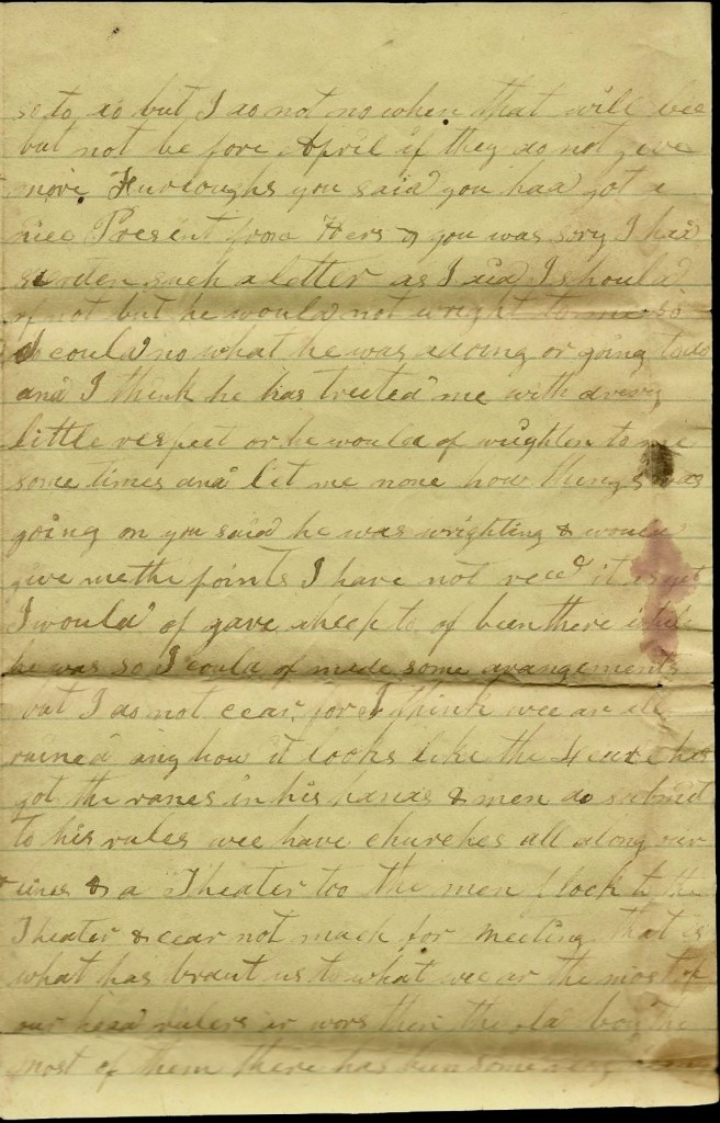 You said I must come and bring you a present. I would so to do but I do not know when that will be but not before April if they do not give more furloughs. You said you had got a nice present from Herse & you was sorry I had written such a letter as I did. I should of not but he would not write to me so I could know what he was a doing or going to do and I think he has treated me with very little respect or he would have written to me sometimes and let me know how things was going on. You said he was writing and would give me the points. I have not received it as yet. I would of have gave a heap to of been there while he was so I could of made some arrangements but I do not care for I think we are all ruined anyhow. It looks like the [ ] has got the reigns in his hands & men so submit to his rules. We have churches all along our lines & a theatre too. The men flock to the theatre & care not much for meeting. That is what has brought us to what we are. The most of head rulers are worse than the old boys, the most of them.