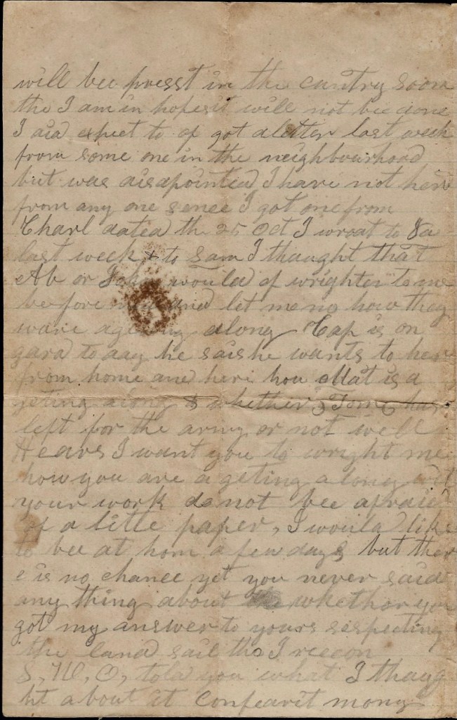 I did expect to of got a letter last week from someone in the neighborhood but was disappointed. I have not heard from anyone since I got one from Charl[otte] dated the 25th of October. I wrote to James last week 7 to Sam. I thought that Ab or John would of written to me before now and let me know how they were a getting along.