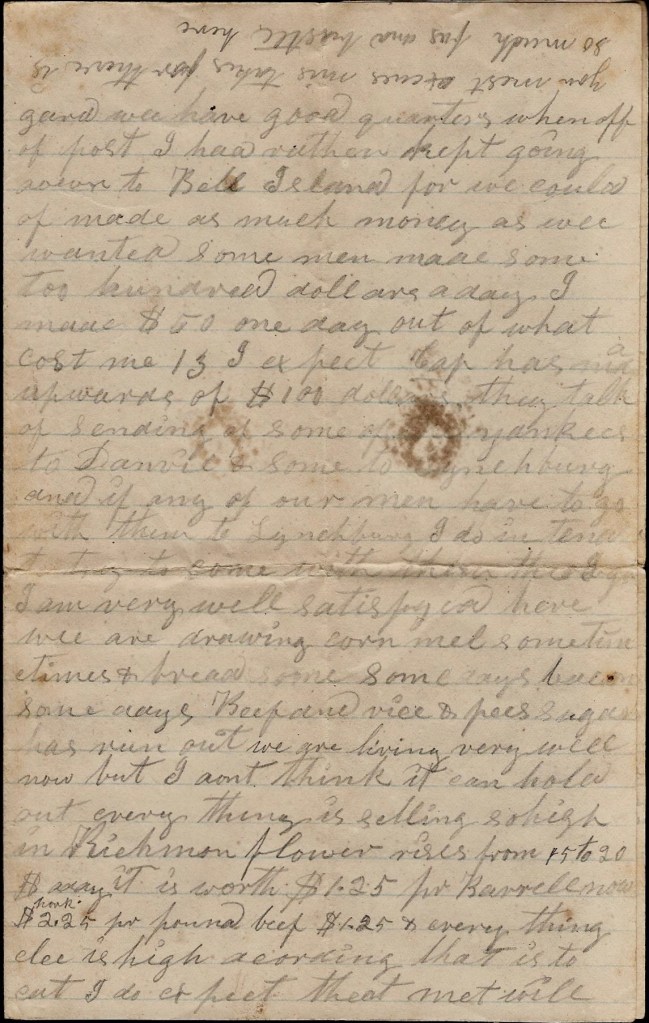 We are guarding. The Yankees has little now down close to the Rocketts [Landing]. We have a long walk. We leave our camp at 8 o’clock in the morning & get back about ten next day. It is a very good place to stand guard. We have good quarters when off of post. I had rather kept going down to Belle Island for we could of made as much money as we wanted. Some men made some two hundred dollars a day. I made $50 one day out of what cost me 13. I expect Cap has made upwards of $100 dollars. They talk of sending some of the Yankees to Danville & some to Lynchburg and if any of our men have to go with them to Lynchburg, I do intend to try to come with them.
