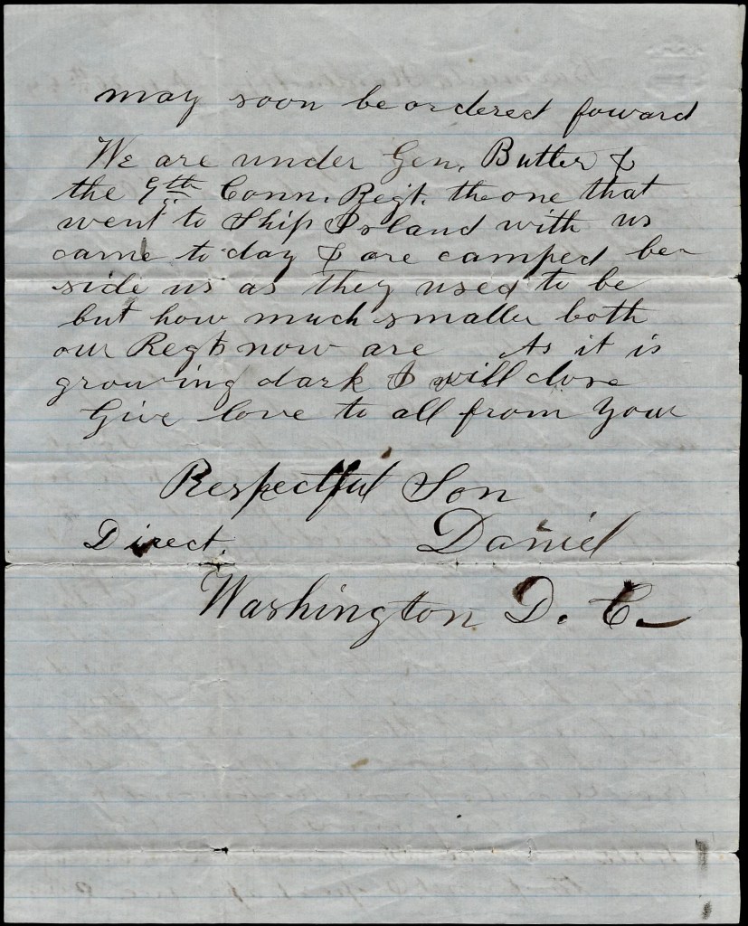 We are under Gen. Butler & the 9th Connecticut Regiment—the one that went to Ship Island with us 1—came today & are camped beside us as they used to be. But how much smaller both our regiments now are. As it is growing dark, I will close. Give love to all. From your respectful son, — Daniel