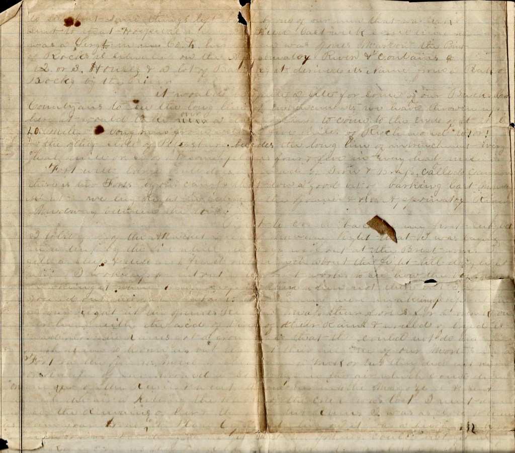 For a week or two back, we heard their bands play & drums beat but now it seems to be quiet. It’s generally thought that they have taken some of their force away from here to work on the Danville Railroad that was damaged so much from the last heavy rain but whether they took their force away or not, I take notice they tried to show themselves. Last Sunday and Monday night they made an attack on our picket line from the James River down till the point of our camp which is but a few thousand yards from the picket line. They made several charges but every time bravely met by our pickets and sent back in a hurry feebler than they came. I have since heard that they were short in wood and tried to advance their line to take a strip of woods. Our pickets held but they could not [ ]….