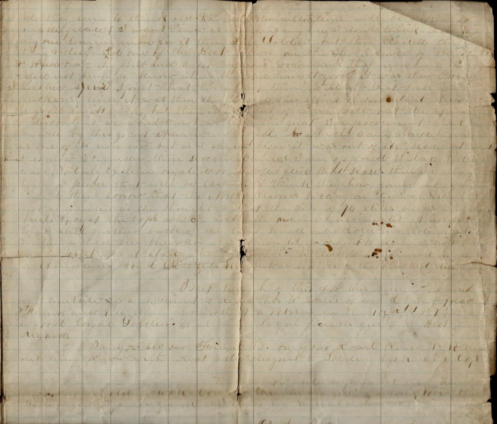 What do the people in Old Bucks county seem to think of the Blair Peace Initiative? Do they seem to think Old Davis’s Administration will be willing to make peace? I want peace as much as anyone. I don’t think there is anyone longing for it more than the soldiers, but they started the thing and disgraced one of the best colors on the face of the globe and ruined one of the best and most prosperous governments. They never were [ ] and did not seem to know when they did have it good. It was their proud, chivalric spirit that provoked them to start that fuss in Jackson’s time. It was then they started the spirit of discontent…I am opposed to peace till we have totally exterminated or subjugated that race. Then we may be a place that will be lasting. I think they have found out to their sorrow that the North’s resources to carry on the war was not as limited as they thought and that the fire of ’76 still burns in their breasts, except the Cops [copperheads]…to dumb to know what was at stake…But enough of this for this time.
