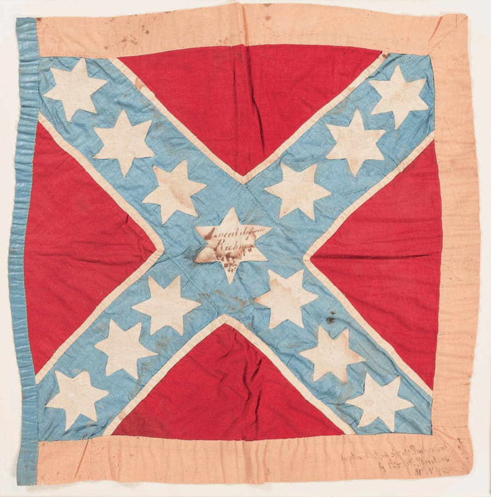 A small Confederate battle flag (24 inches by 25 inches) marked “Local defence/Richmond/Co. G/10th Va/10th May 1864″ and marked, Captured April 3rd 65 at Richmond by 1st Lt. W. Bredow, 81st NY Vols.” sold at auction recently for $55,000.