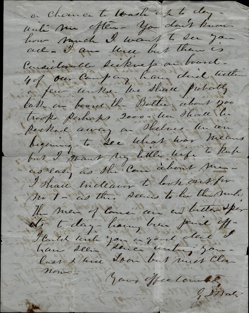 We are still here. There is no doubt about our going in the Baltic, I think on an expedition. I can’t write you much now. Will do so soon. Our company are now at the Express Office sending their money home. Expect to be ordered to fall in any minute. We have just come on here from the ship & shall go about a mile to hair the day to ourselves. I have been over to Hampton and also the rivers. We are getting pretty dirty & shall have a chance to wash up today. Write me often. You don’t know how much I want to see you all. I am well but there is considerable sickness on board. Four of our company have died within a few weeks.