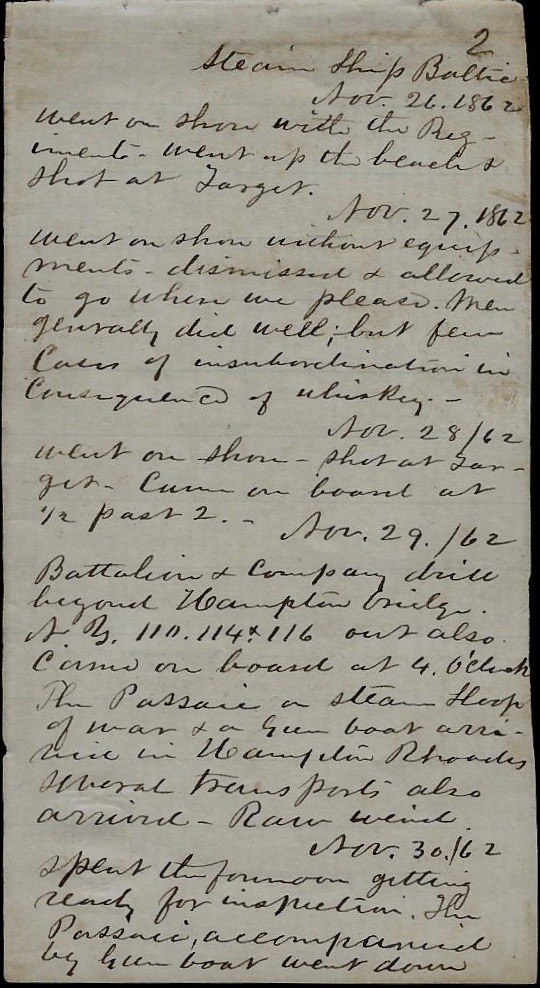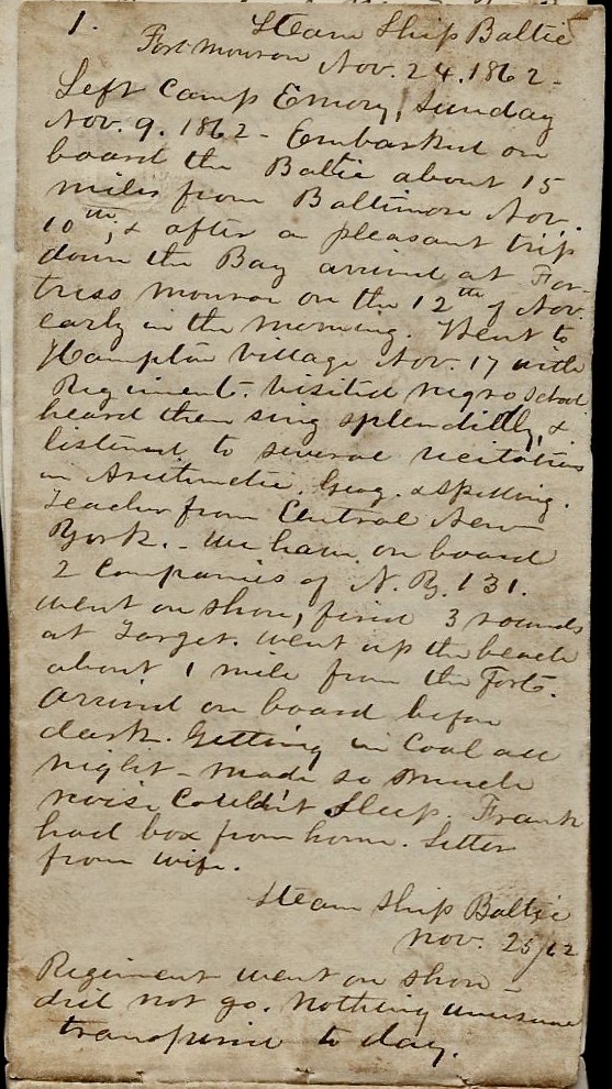 November 24, 1862—Left Camp Emory Sunday November 9, 1862. Embarked on board the Baltic about 15 miles from Baltimore November 10th; and after a pleasant trip down the Bay, arrived at Fortress Monroe on the 12th of November early in the morning. Went to Hampton Village Nov. 17th with regiment.