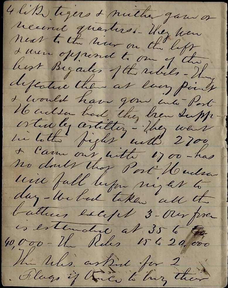 Saturday, May 30th 1863—Hard thunder and rain this morning. Talked with wounded sergeant of 131st New York. 1 Thinks when he left [Port Hudson] there were 3,000 killed & wounded on our side. Represents the fighting as the most desperate of the war. The Negro Brigade fought like tigers & neither gave or received quarters. They were near to the river on the left & were opposite to one of the best brigades of the rebels. They defeated them at every point & would have gone into Port Hudson had they been supported by artillery. They went into the fight with 2700 and came out with 1700.