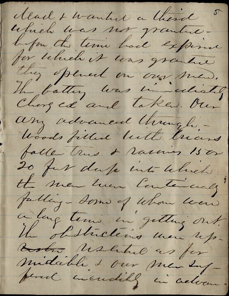 They took a good many of our men. A good many of my regiment was taken but I made my escape. I expect[ed] to be shot when [I] climbed over the breastworks but I did not. I took my heels down across the lot. I expected to fall [with] every step. I seen the boys fall on every side of me, sure enough I did. I never expected to raise my head again. I don’t know how long I laid there but I don’t think I laid there long [before] I came to myself again. I thought I would try my luck again. They didn’t put only three holes through my old cap. There didn’t only one ball strike my head but I wagged along till I got to the wagon. They loaded me in and took me to the hospital but it was a long time before they got my wound dressed.