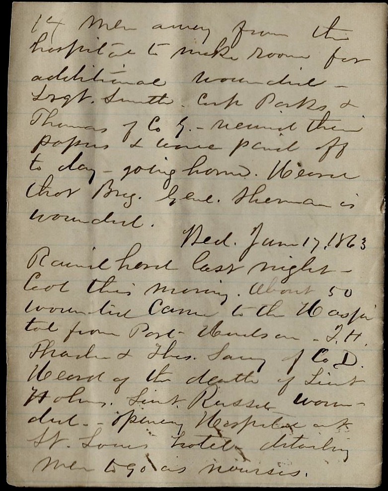 Wed., June 17th 1863—Rained hard last night. Cool this morning. About 50 wounded came to the hospital from Port Hudson [including] Israel H. Thrasher & Thomas Savery of Co. D. Heard of the death of Lieut. Holmes, Lieut. [George B.] Russell wounded. Opening hospital at St. Louis Hotel. Detailing men to go as nurses.