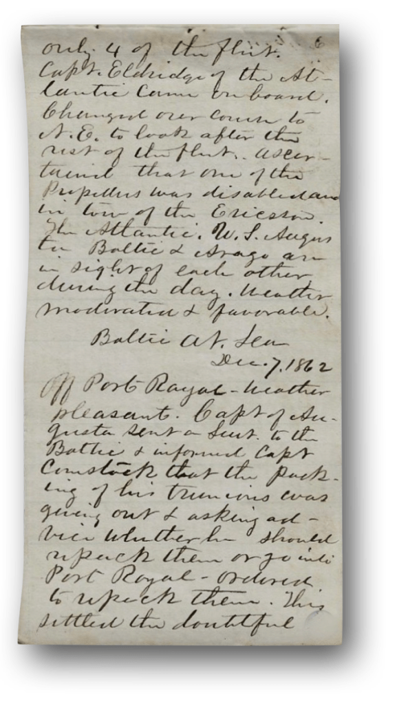 December 6, 1862—At sea. In the morning signaled only 4 of the fleet [in sight]. Capt. Eldridge of the Atlantic came on board. Changed our course to northeast to look after the rest of the fleet. Ascertained that one of the propellers was disabled and in tow of the Ericsson. The Atlantic, U. S. Augusta, Baltic & Arago are in sight of each other during the day. Weather moderated & favorable.