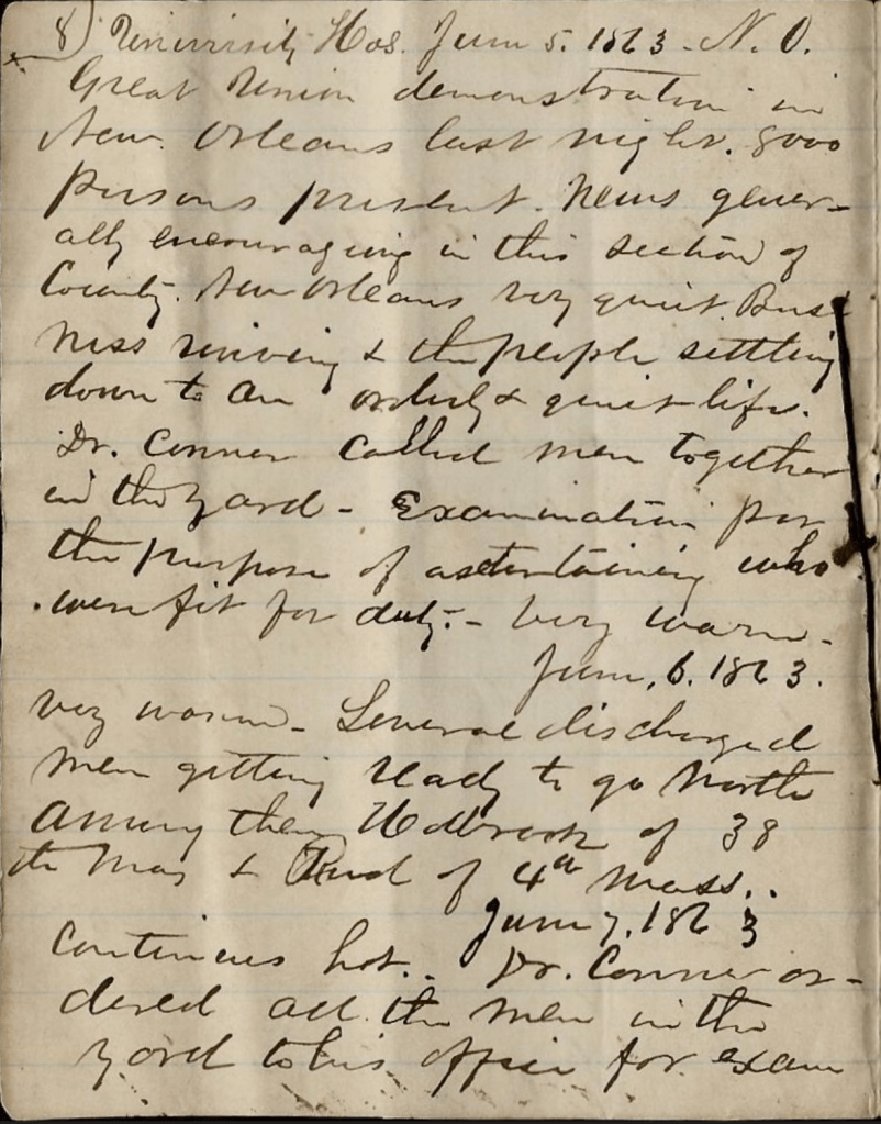 University Hospital, June 5, 1863, New Orleans. Great Union demonstration in New Orleans last night. 8,000 persons present. News generally encouraging I this section of the county. New Orleans very quiet. Business reviving and the people settling down to an orderly & quiet life. Dr. Conner called men together in the yard. Examination for the purpose of ascertaining who were city for duty. Very warm.