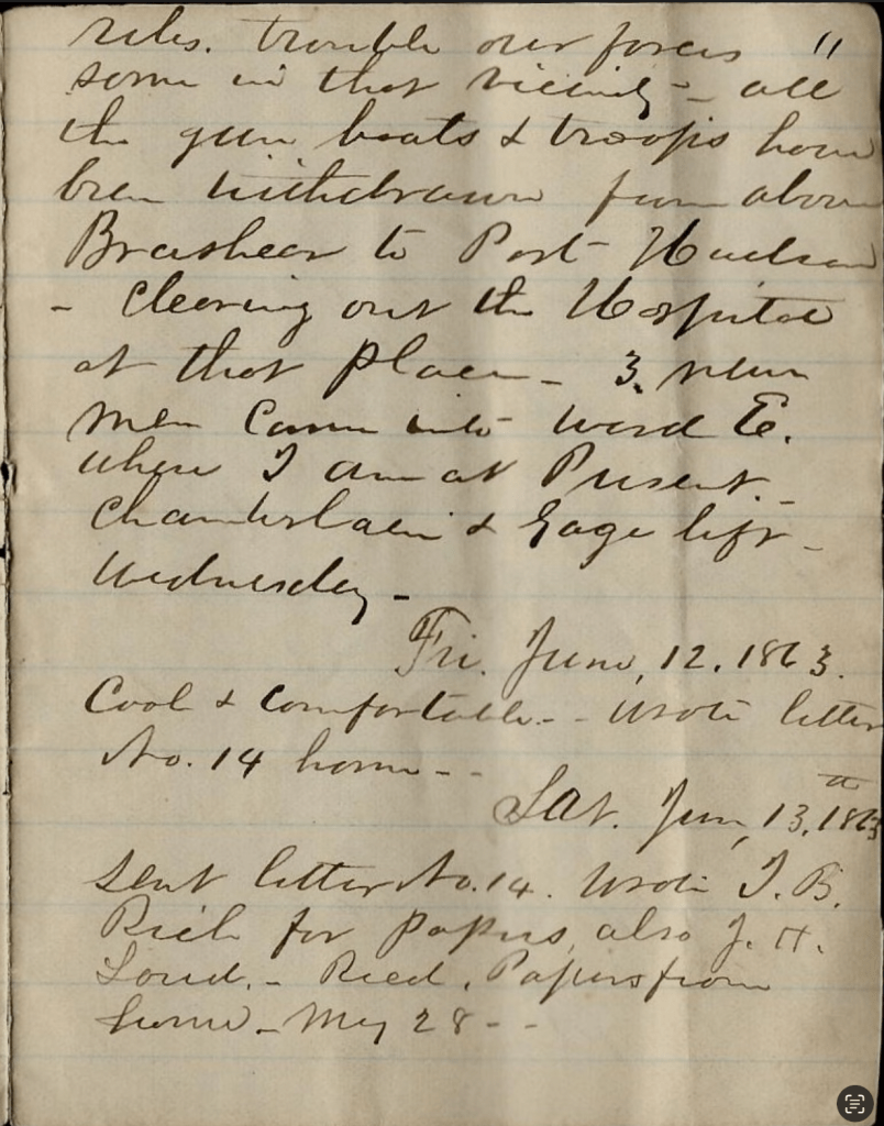 June 11th 1863—Showery. Cooler. Some thunder. Put up cistern in the hospital. Fifty men arrived at hospital from Brashear City. Learn from them that the Rebs trouble our forces some in that vicinity. All the gunboats and troops have been withdrawn from above Brashear to Port Hudson. Clearing out the hospital of that place. Three new men came into Ward E where I am at present. Chamberlain and Gage left Wednesday.