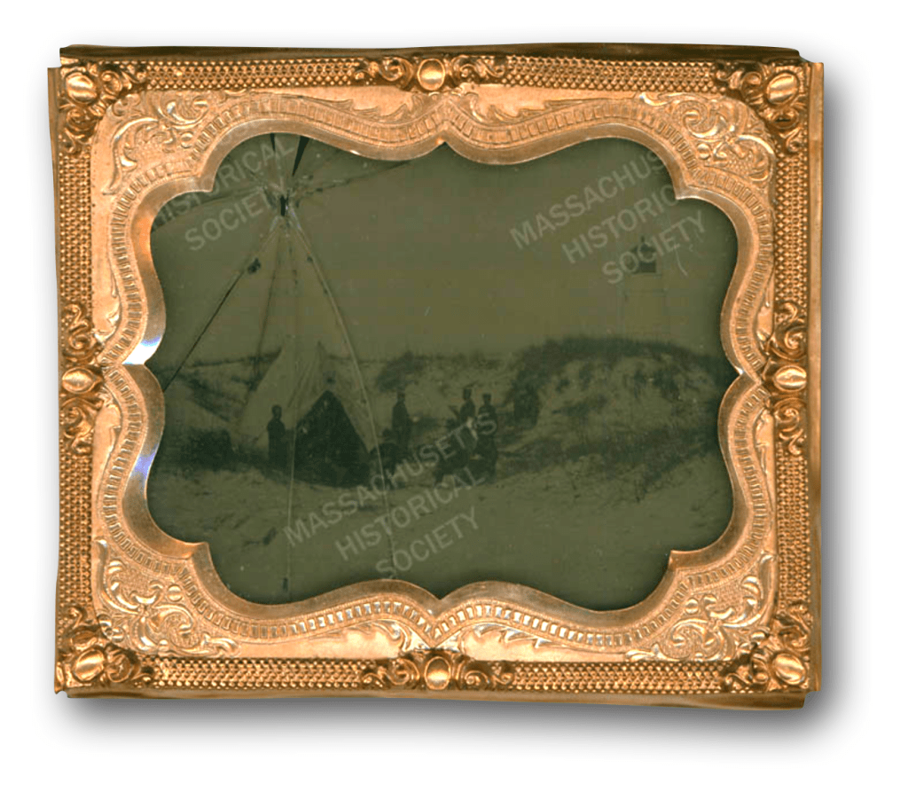 This ambrotype depicts members of the 38th Massachusetts Volunteer Infantry Regiment at camp on the beach of Ship Island, Miss. during the Civil War. The photograph was taken in Dec. 1862 by an unknown photographer and probably was owned by Francis William Loring, a lieutenant with the regiment; an inscription on the verso of the image reads, “Field & Staff 38th M.V. FW Loring Ship Island, Miss. Dec. 25, 1862.” Photo. 2.97 Removed from the Francis William Loring papers[Digital Commonwealth, Massachusetts Collection On Line]