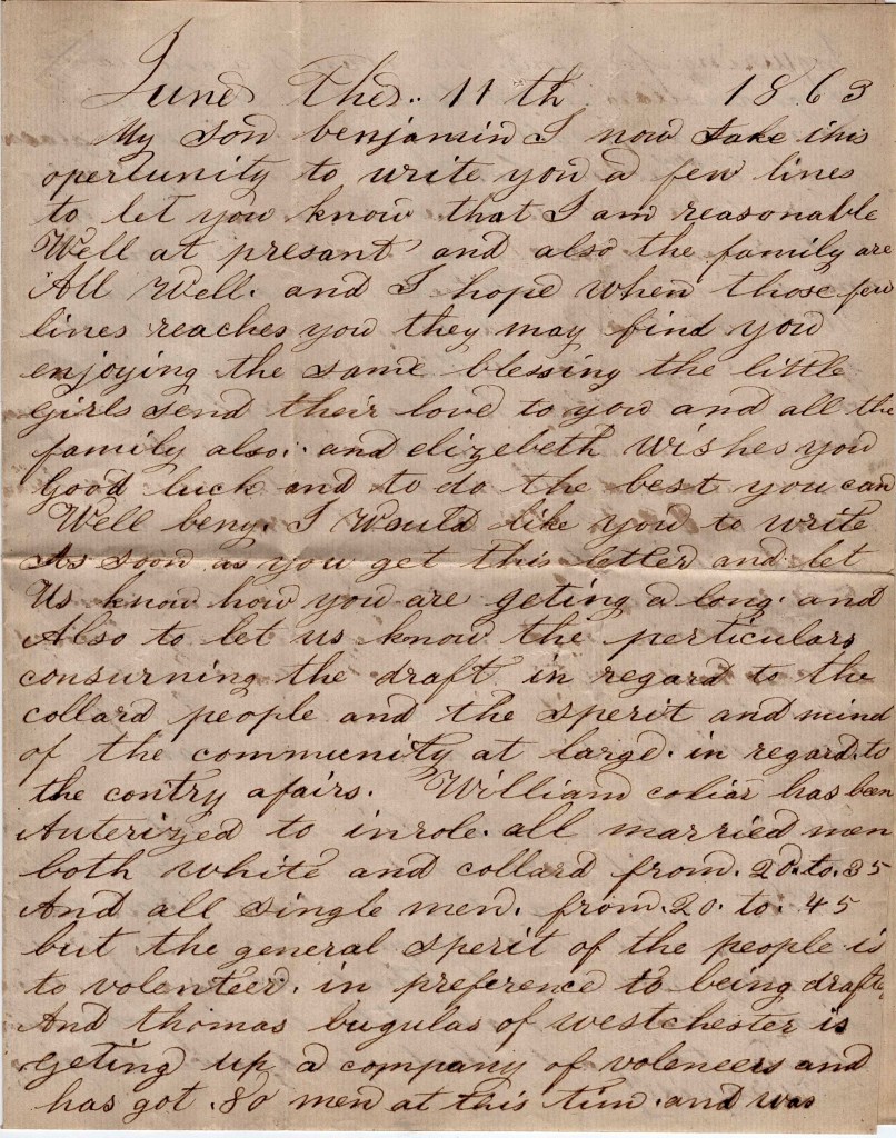 Well, Benj, I would like you to write as soon as you get this letter and let us know how you are getting along and also to let us know the particulars concerning the draft, in regard to the colored people and the spirit and mind of the community at large, in regard to the country affairs. William Collier has been authorized to enroll all married men, both white and colored, from 20 to 35, and all single men from 20 to 45. But the general spirit of the people is to volunteer in preference to being drafted and Thomas Bugulas [?] of West Chester is getting up a company of volunteers and has got 80 men at this time and was inquiring for you. He wants a company of good colored men to march with him as soon as possible.