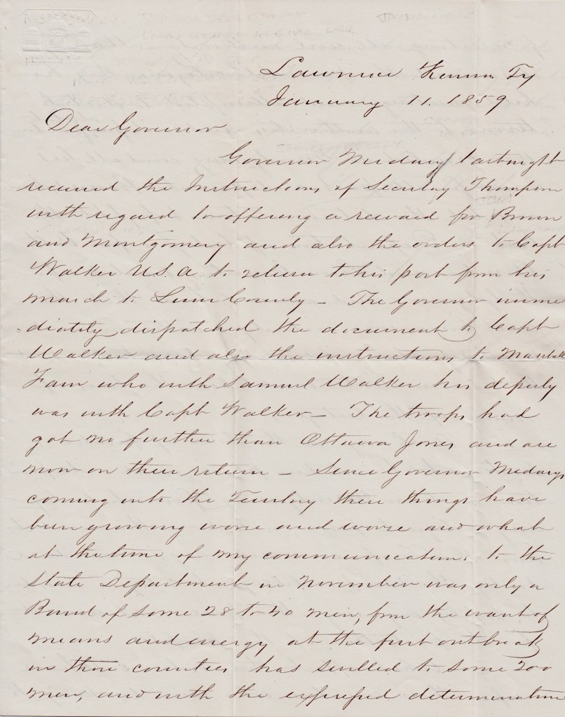Governor [Samuel] Medary last night received the instructions of Secretary Thompson with regard to offering a reward for Brown and Montgomery and also the orders to Capt. Walker, U. S. A. , to return to his post from his march to Linn County. The Governor immediately dispatched the document to Capt. Walker and also the instructions to Marshall [William P.] Fain who with Samuel Walker, his deputy, was with Capt. Walker. The troops had got no further than Ottawa [John Tecumseh] Jones’ [house near Ottawa, KT] and are now on their return.