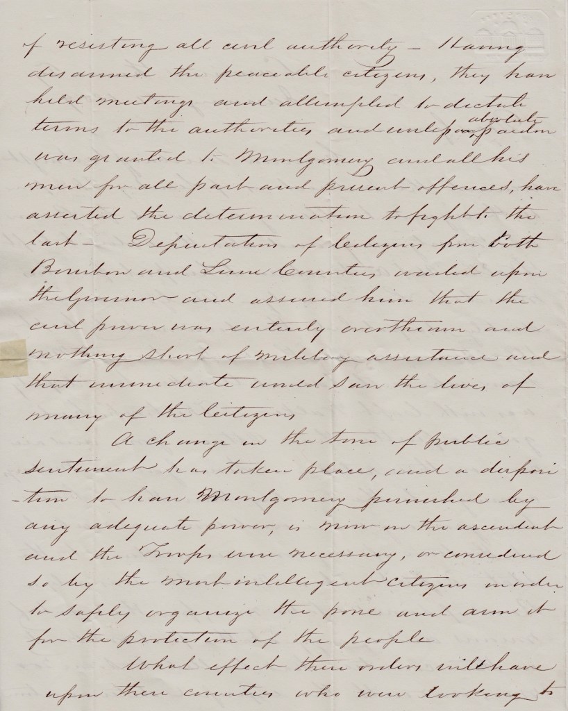 A change in the tone of public sentiment has taken place, and a disposition to have Montgomery punished by any adequate power, is now in the ascendant and the troops even necessary, or considered so by the most intelligent citizens in order to safely organize the posse and arm it for the protection of the people. What effect these orders will have upon these counties who were looking to the Governor for aid cannot now be told but must be disastrous.