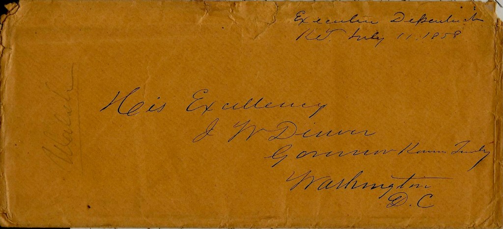 These letters were written by Hugh Sleight Walsh (1810-1877), a native of New Windsor, New York, who “spent his entire childhood and much of his early adulthood in New York, but also lived for a time in Alabama before coming to Kansas Territory in 1857. In Kansas, Walsh worked as a private secretary, first to Frederick P. Stanton and later to James W. Denver, with whom he appears to have cultivated a close political relationship. On May 12, 1858, Walsh became the territorial secretary, replacing Denver, who had vacated the position to become territorial governor. As territorial secretary, Walsh had the job of serving as acting governor when necessary. This occurred four times total.