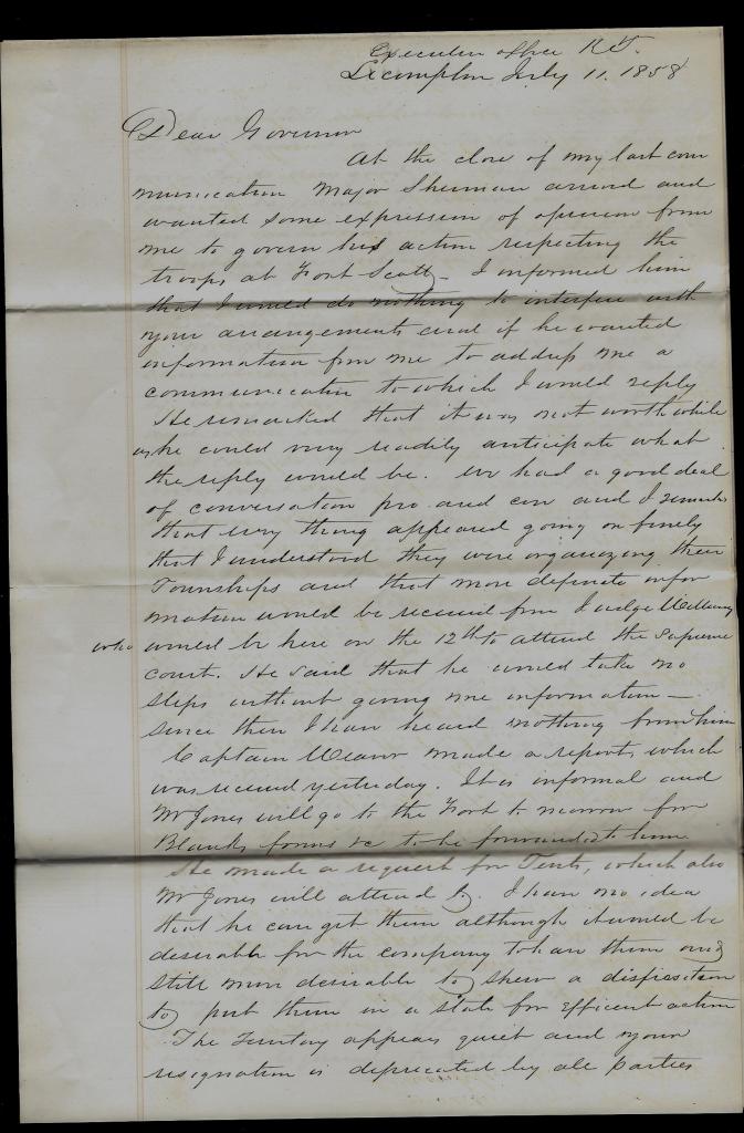 At the close of my last communication, Major Sherman arrived and wanted some expression of opinion from me to govern his action respecting the troops at Fort Scott. I informed him that I would do nothing to interfere with your arrangement and if he wanted information from me, to address me a communication to which I would reply. He remarked that it was not worth while as he could very easily anticipate what the reply would be. We had a good deal of conversation, pro and con, and I remarked that everything appeared going on finely, that I understood they were organizing their townships and that more definite information would be received from Judge Williams who would be here on the 12th to attend the Supreme Court. He said that he would take no steps without giving me information. Since then I have heard nothing from him.