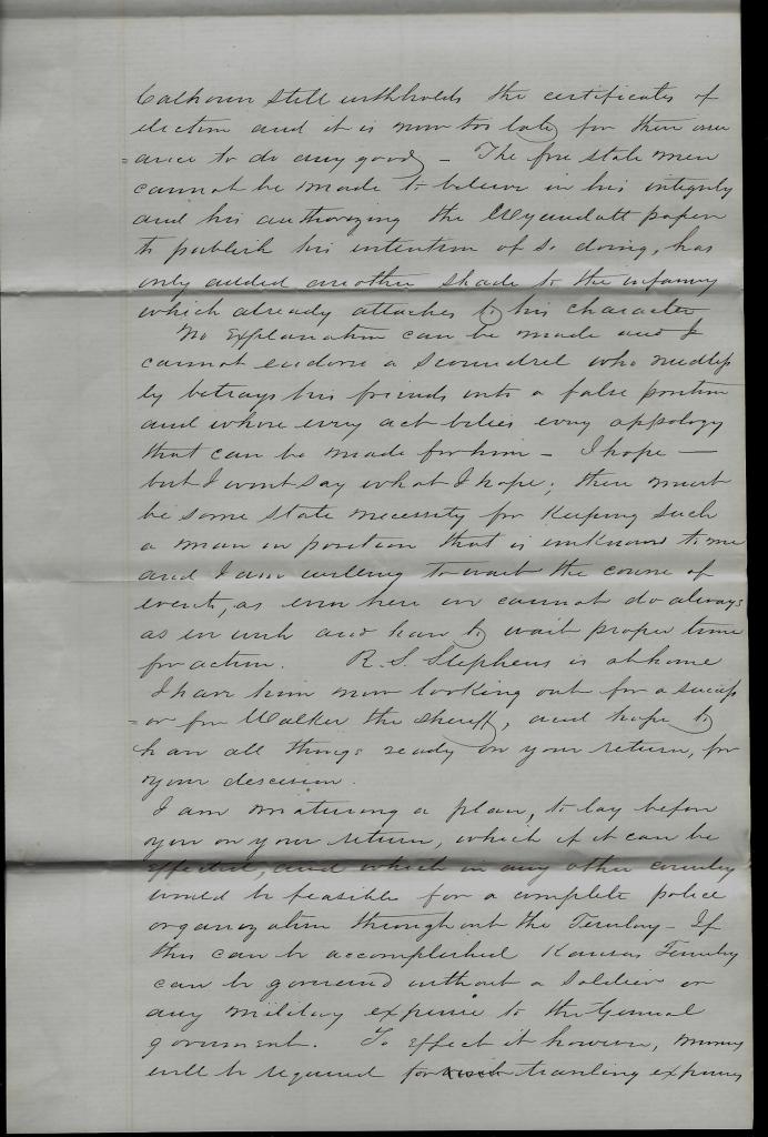 R. S. Stephens is at home. I have him now looking out for a successor for [Samuel] Walker, the sheriff, and hope to have all things ready on your return for your decision.