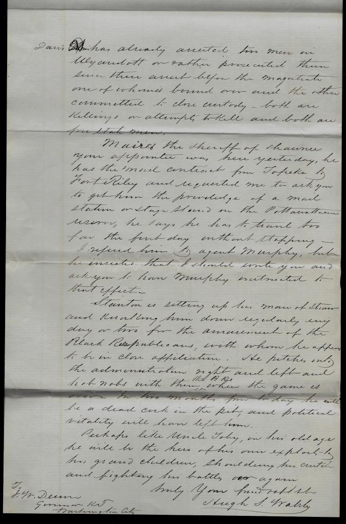 [Thomas W.] Maires, 3 the Sheriff of Shawnee you appointed was here yesterday. He has the mail contract for Topeka to Fort Riley and requested me to ask you to get him the privilege of a mail station or stage stand on the Potawatomies’ reserve. He says he has to travel too far the first day without stopping. I referred him to agent Murphy but he insisted that I should write you and ask you to have Murphy instructed to that effect.