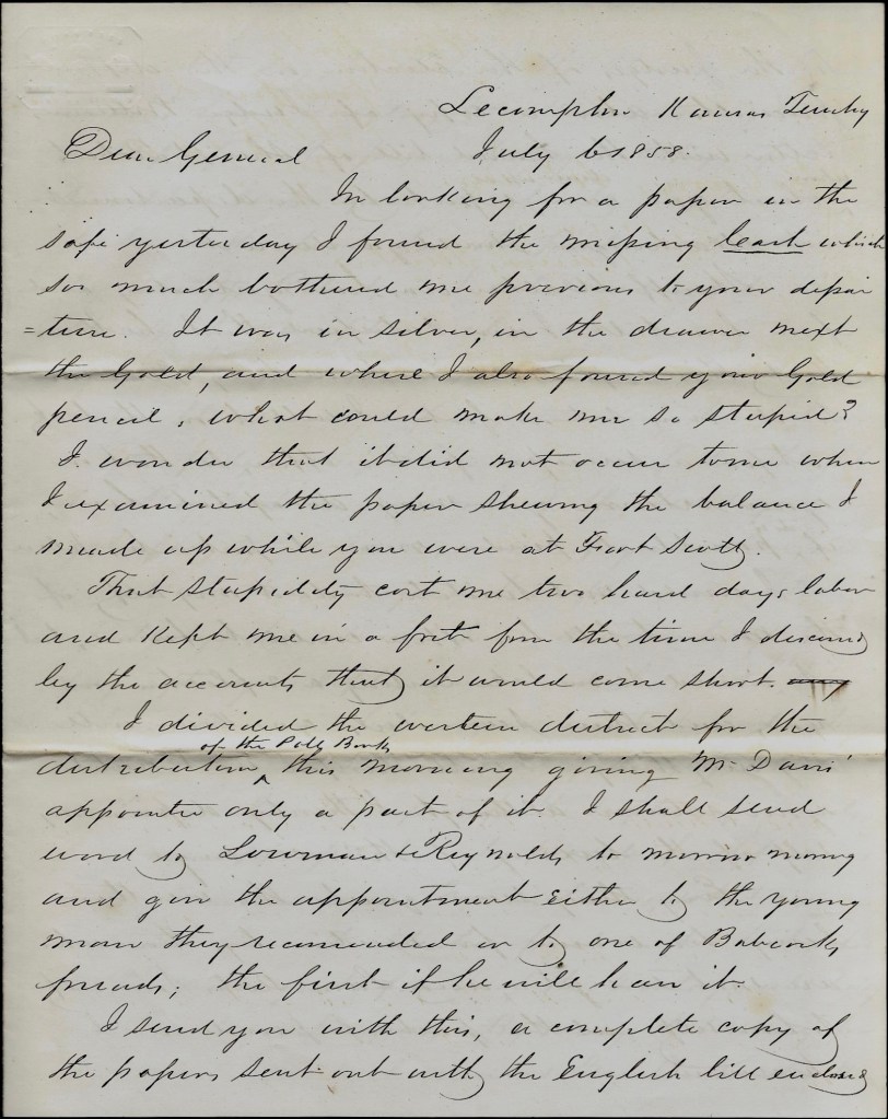 In looking for a paper in the safe yesterday I found the missing cash which so much bothered me previous to your departure. It was in silver in the drawer next the gold, and where I also found your gold pencil. What could make me so stupid? I wonder that it did not occur to me when I examined the paper showing the balance I made up while you were at Fort Scott. That stupidity cost me two hard days labor and kept me in a fright from the time I discovered by the accounts that it would come short.