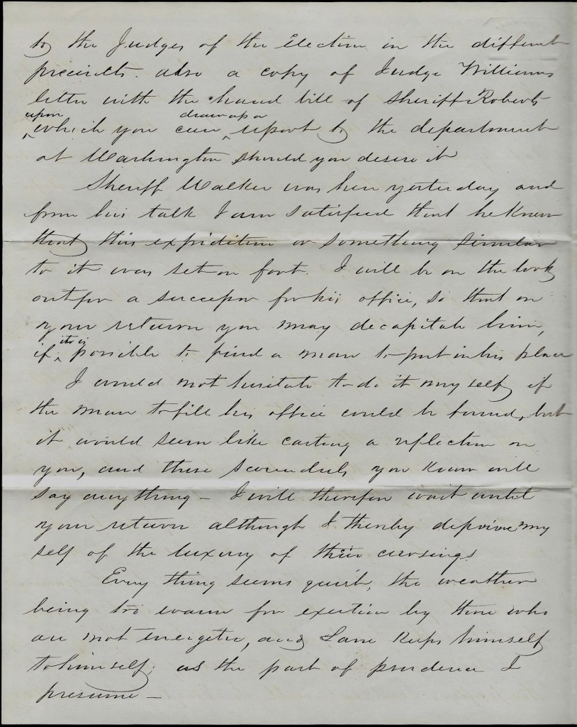 Sheriff [Samuel] Walker 1 was here yesterday and from his talk I am satisfied that he knew that this expedition—or something similar to it—was set on foot. 2 I will be on the lookout for a successor for his office so that on your return you may decapitate him if it is possible to find a man to put in his place. I would not hesitate to do it myself if the man to fill his office could be found, but it would seem like casting a reflection on you, and these scoundrels you know will say anything. I will therefore wait until your return although I thereby deprive myself of the luxury of their cursings.