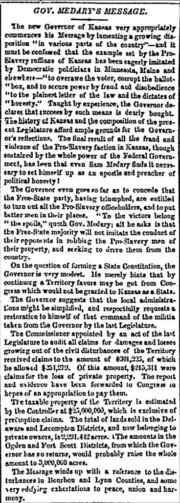 I have been putting off writing from time to time from various causes but mostly from the snarl things got into just upon the arrival of the Governor. What between the fuss in Linn & Bourbon [counties] and giving Governor [Samuel] Medary information and the preparation for holding the session of the Legislature and then fight with me respecting printing and exenses, I have been kept fully busy until within a day or two.