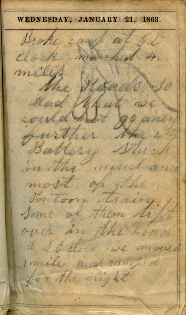 Tuesday the ground was frozen hard enough to move heavy artillery but in the course of the night it commenced raining and the mud was two feet deep in the road made by so many teams, the wheels cutting down to the hubs. We worked until dark helping up pontoon bridges by ropes hitched onto each side of the bridge boat, some 15 men on each side of the road with six mules on the tung, & the way we pulled was a caution through mud some two miles and it rained all the time. Then in the dark went back to camp where we stayed the night before, all wet and tired, I assure you. [We] put up our tents, built fires and it was 2 o’clock before I got dried and the mud rubbed off. Some went to bed in their clothes, wet and muddy. We laid in camp next day. Rained some. Friday we started back to our old camping ground, supported batteries on the road. Arrived in camp about 3 p.m. all tuckered out.