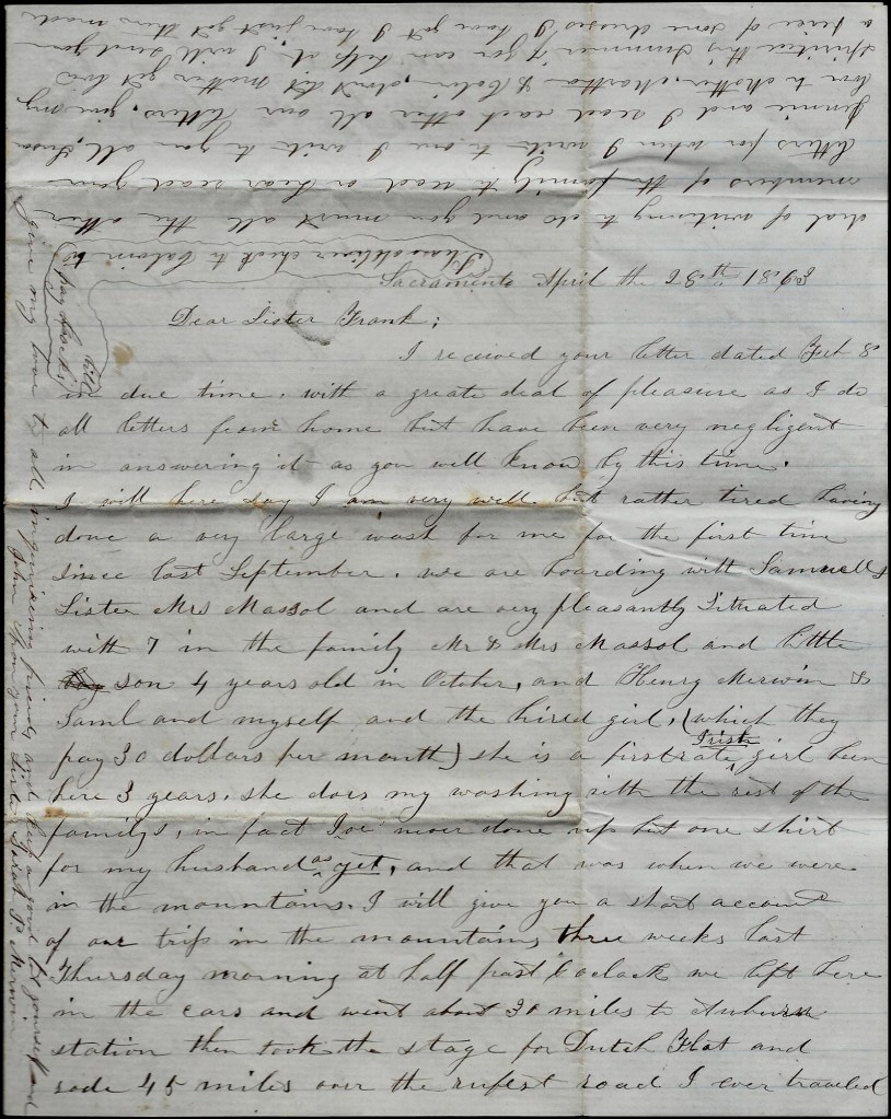I received your letter dates February 8th in due time, with a great deal of pleasure as I do all letter from home but have been very negligent in answering it as will know by this time. I will here say I am very well but rather tired having done a very large wash for me for the first time since last September. We are boarding with Samuel’s sister, Mrs. Massol and are very pleasantly situated with 7 in the family—Mr. and Mrs. Massol and little son 4 years old in October, and Henry Merwin & Samuel and myself and the hired girl (which they pay 30 dollars per month). She is a first rate Irish girl. Been here three years. She does my washing with the rest of the family’s. In fact, I’ve never done up but one shirt for my husband as yet, and that was when we were in the mountains.