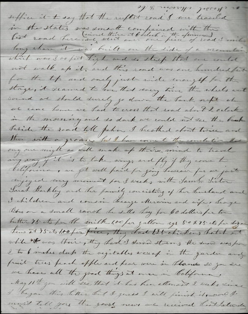 I will give you a short account of our trip in the mountains. Three weeks last Thursday at half past 6 o’clock, we left here in the cars and went about 30 miles to Auburn Station. Then took the stage for Dutch Flat and rode 45 miles over the roughest road I ever traveled. Suffice it to say that the roughest road I ever traveled in the States was smooth compared with the best road here. We arrived there at 6 o’clock in the afternoon, and went over one piece of road 3 miles long where it was built on the side of a mountain which was 300 feet high and so steep that one could not walk up it, and this road was one hundred feet from the top and only just wide enough for the stage. It seemed to me that every time the wheels went round we should surely go down the bank next. When we came home, we had to cross that road about 2 o’clock in the morning and so dark we could not see the bank beside the road. Tell John I breathed about twice and then with a groan, but I have come to the conclusion that anyone might as well make up their mind to travel anyway if it is to take wings and fly if they come to California. 1