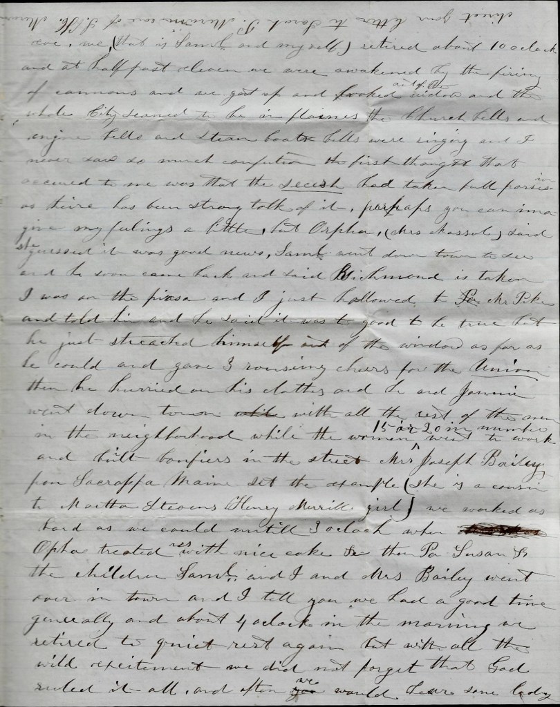 May 11th. You will see that it has been almost two weeks since I began this letter but I guess I will finish it. Now I must tell you the good news we received last Saturday eve. We (that is, Samuel and myself) retired about 10 o’clock and at half past eleven we were awakened by the firing of cannons and we got up and looked out of the window and the whole city seemed to be in flames. The church bells and engine bells and steam boat bells were ringing and I never saw so much confusion. The first thought that occurred to me was that the secesh had taken full possession as there has been strong talk of it. Perhaps you can imagine my feelings a little. But Orpha (Mrs. Massol) said she guessed it was good news. Samuel went down town to see and he soon came back and said Richmond is taken. I was on the piazza and I just hallowed to Mr. Pike and told him and he said it was too good to be true but he just stretched himself out of the window as far as he could and gave three rousing cheers for the Union. Then he hurried on his clothes and he and Johnnie went down town with all the rest of the men in the neighborhood while the women, 15 or 20 in number, went to work and built bonfires in the street. Mrs. Joseph Bailey from Saccarappa, Maine, set the example (she is a cousin to Martha Stevens, Henry Merrill’s girl). We worked as hard as we could until 3 o’clock when Orpha treated us with nice cake & then Pa, Susan, & the children, Samuel and I, and Mrs. Bailey went over in town and I tell you we had a good time generally and about 4 o’clock in the morning we retired to quiet rest again. But with all the wild excitement, we did not forget that God ruled it all and often we would hear some lady say, “Glory to God,” with tears rolling down her cheeks.