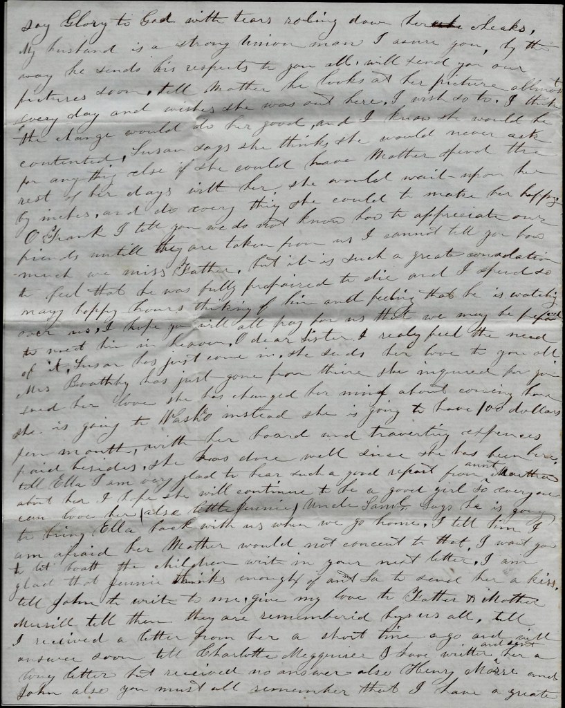 Oh Frank, I tell you, we do not know how to appreciate our friends until they are taken from us. I cannot tell you how much we miss Father, but it is such a great consolation to feel that he was fully prepared to die and I spend so many happy hours thinking of him and feeling that he is watching over us. I hope you will all pray for us that we may be prepared to meet him in heaven. Oh dear sister, I really feel the need of it. Susan has just come in. She sends her love to you all. Mrs. Boothly has just gone from there. She enquired for you and sends her love. She has changed her mind about coming here. She is going to Washeo instead. She is going to have 100 dollars per month with her board and traveling expenses paid besides. She has done well since she has been here.