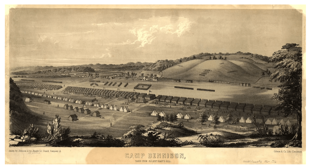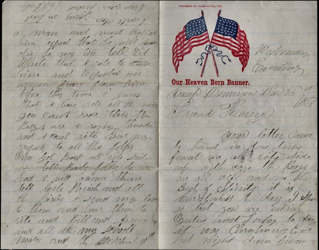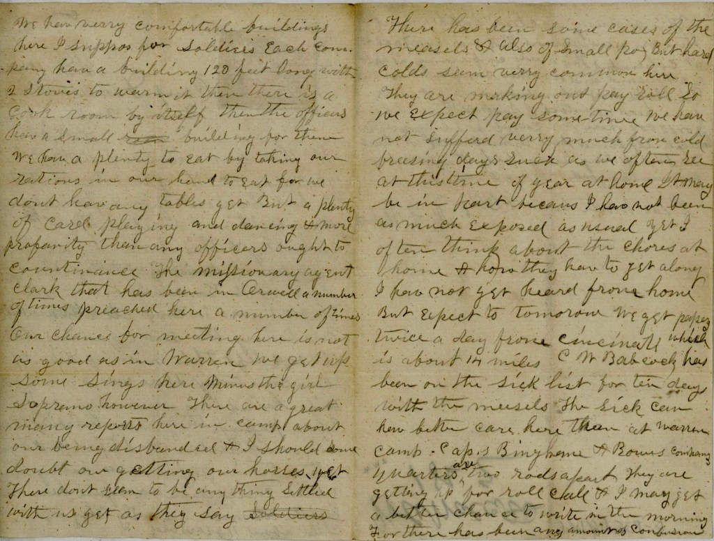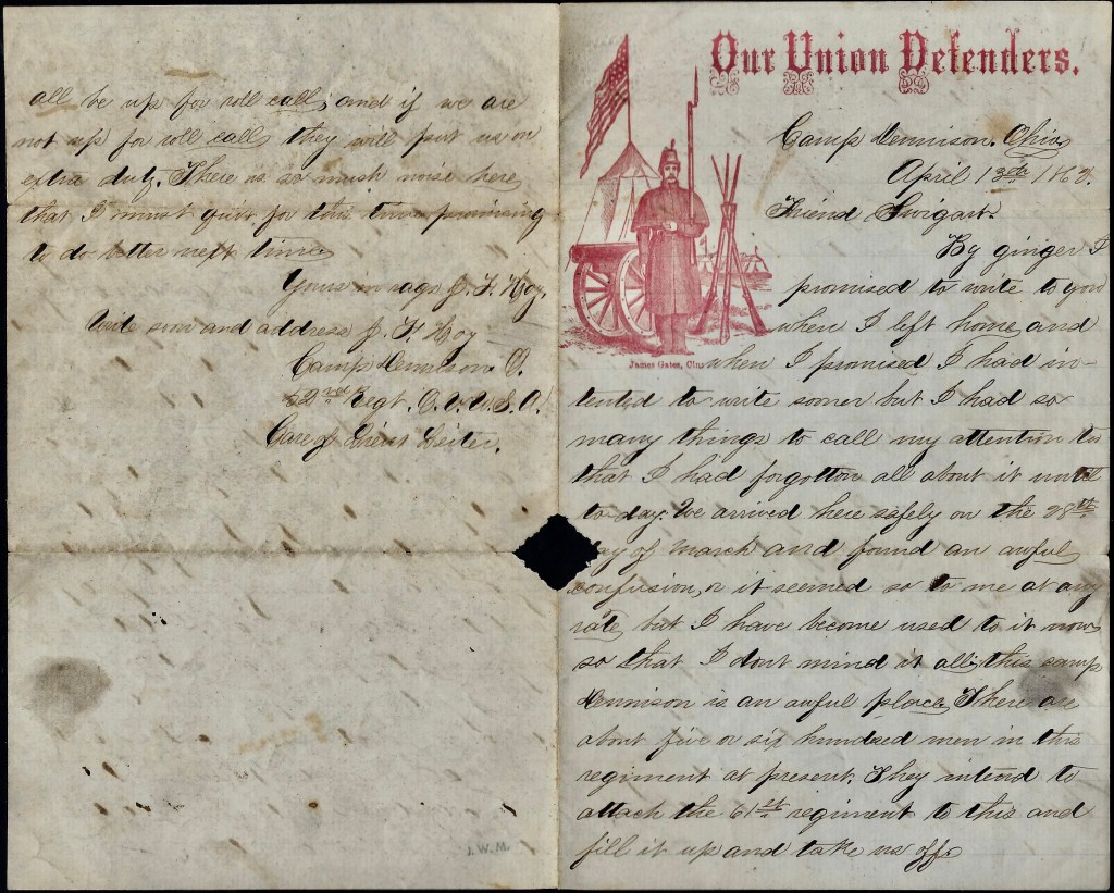 If you was here and could see this camp (which you could), I know you would say it was the grandest thing you ever saw. It is a beautiful place most assuredly. Well, there was a man got on a drunk and went to a little town below the camp and got a gun and broke in a drug store through the window and played thunder. Col. [Daniel] McCook ordered the guard to take him so they went down, brought him up, and the Colonel said that he would have to walk around the pump for five days with a guard around him and I tell you, the Colonel made things go just as he says.