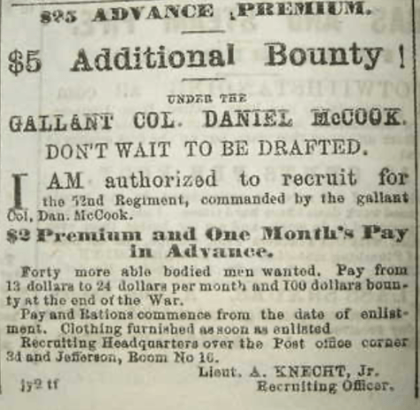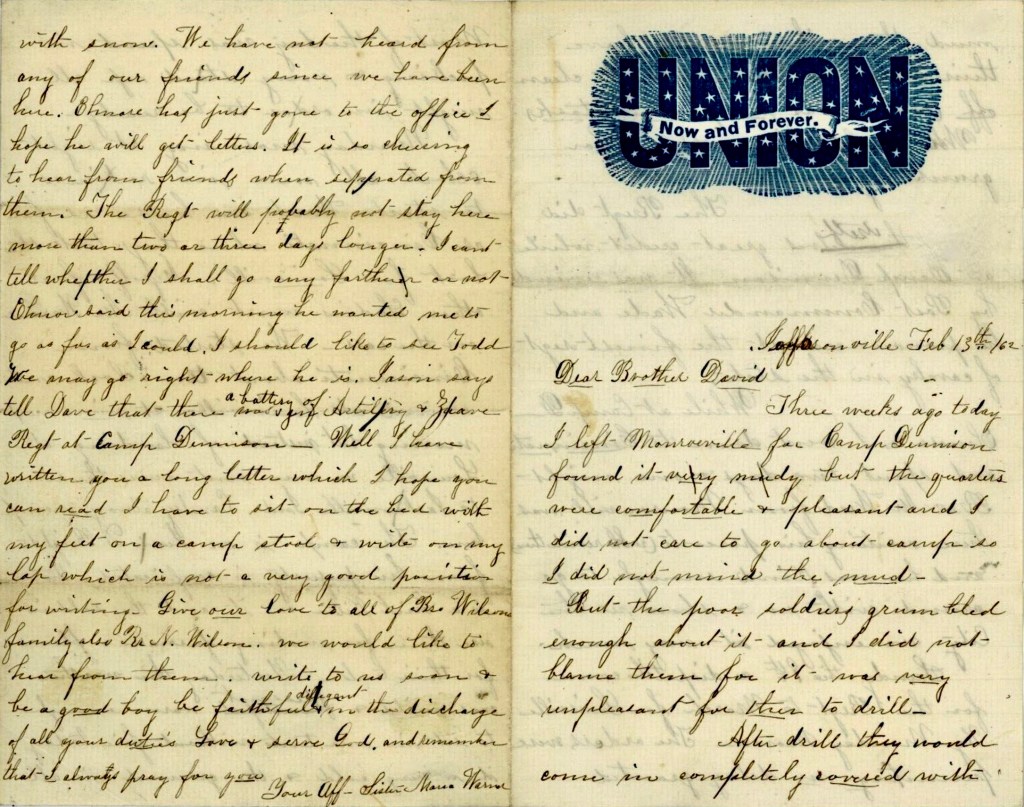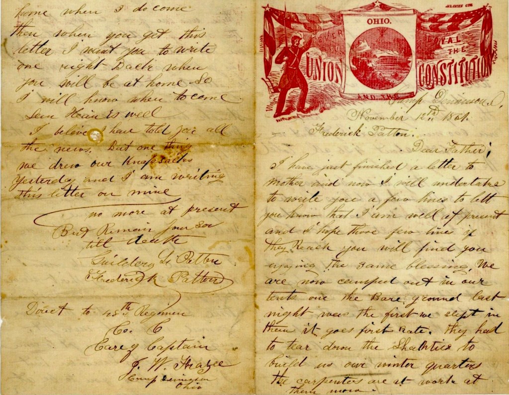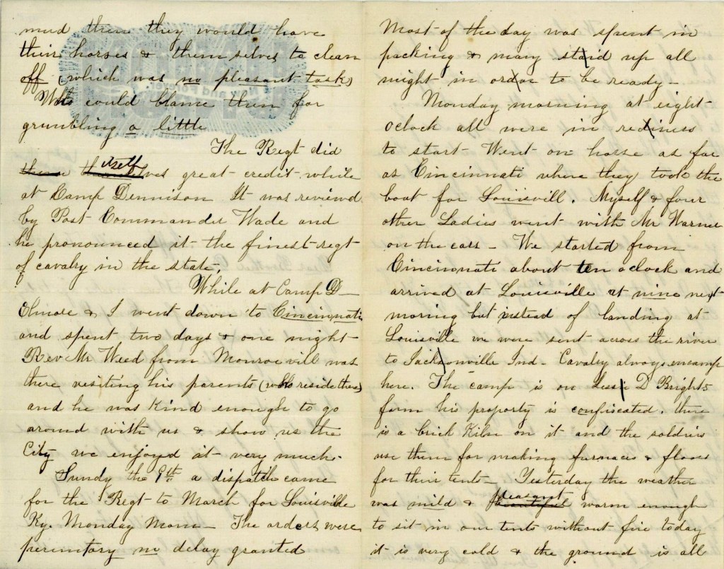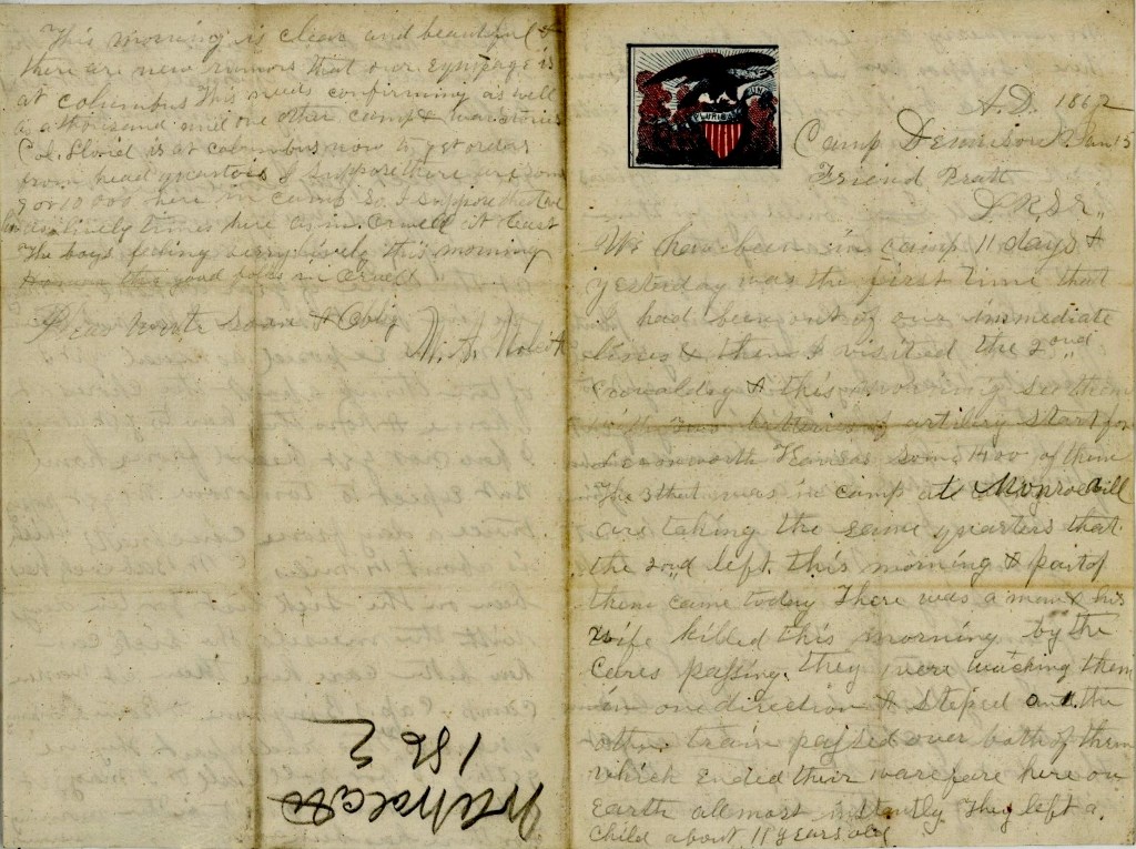 The 52nd Ohio was commanded by Col. Daniel McCook. They began their training at Columbus but completed it at Camp Dennison near Cincinnati. They were mustered into service on 23 August 1862, the day before this letter was penned. Two days later they were marched to Cincinnati and crossed the Ohio River to Covington, Kentucky, where the command boarded railroad cars for Lexington, Kentucky. They were there assigned to the 36th Brigade, 11th Division, Army of Ohio. Their first engagement was in the Battle of Perryville on 8 October 1862.