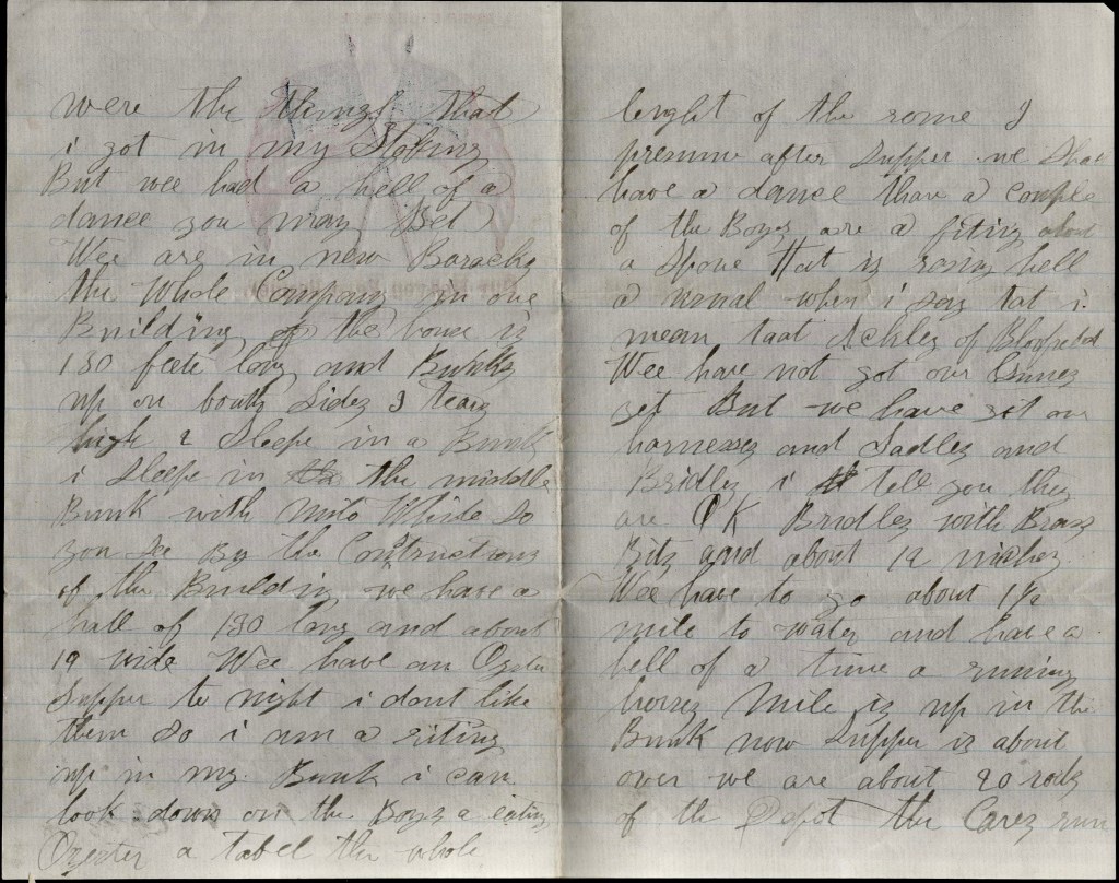 Well, Mattie, this is Sunday and it is awful to think how men that has been born and raised in a civilized nation will carry on ,swear and dance, and do everything that is unbecoming for a civil man to be guilty of. Well this [is] a gay place and gay people here. The women are no ways backward. They just walk past the guard as though they had a right to. But you know that the women are as independent as a hog on ice.