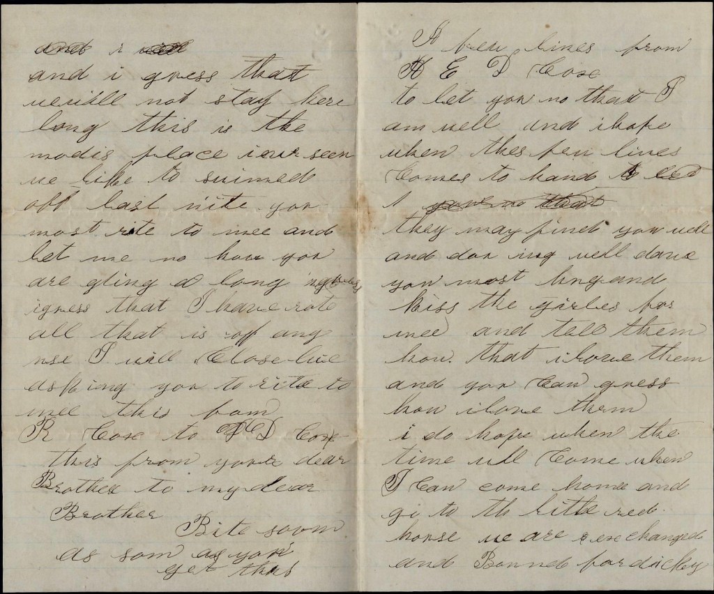 This is the 5th [letter] I shall have written you since receiving one from you. My health is much the same as when I wrote last. Mrs. Lawrence’s letter was dated June 3rd but she must have meant 23rd for your last was dated the 5th June. I immediately answered it and am much grieved that you are all sick and particularly that you are sick for when you are not able to wait upon the little children who are sick too, I fear that they and you will suffer for want of nursing. But I do hope that e’re this, you are all better, if not entirely well. I have a letter from Mug stating that sister was packed up and ready to start here to see me and then to go on to Tennessee, if able to travel. But she is in very bad health and I am very doubtful of her being able to go on to see you immediately. but if she is, she will go on without any more than necessary delay. In the mean time if you are able, you had better return home and make such arrangements for her reception and comfort as best you can for she will need all the attention that you will be able to give her. And should anything occur to prevent her going on, I will let you know it if possible. Please write to me immediately for it would seem that you had forgotten that I am intensely anxious always to hear from you and the poor “little ones.” Give them my love and kiss them by sister. Goodbye. Write soon.