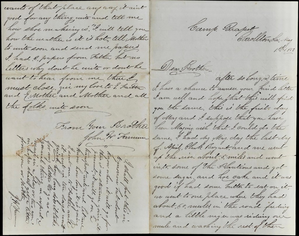 [March 10] I think that this river will be clear through, perhaps by the time you get this letter. There is 13 or 14 Reg’t. gone up the river. The troops have all gone between here and New Orleans and some from the City. I never saw such ships, Men of War, in my life. The Gun Boat Essex went up the other day…We have lost 2 more men out of Co. B…I had the Jaundice…Charley…got a letter from George Commings and…he wants to know how I like the Negrows. If he could hear me talk, I think he would know, but rather he wants to know how I like fighting for negroes. I am not fighting for them but I don’t know but some of the men are, for they go and dance with them and hug them and that is not all…I hear there is a great change of Property at the Falls…Troops are going up the river all the time so look out for a big time. The Rebels will think they are come for, this time. I hear that Geo. Commings thinks of coming home on a furlough…I hope he will…