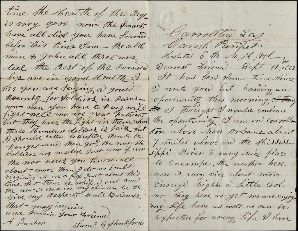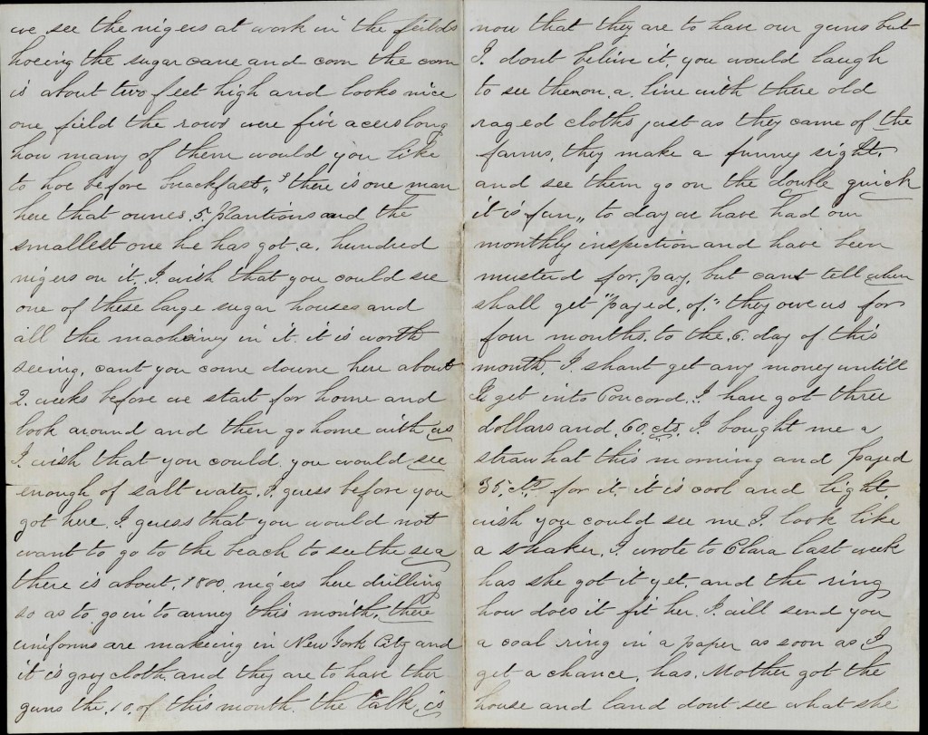 By the way, I forgot to tell you about our sleeping arrangement [on New Orleans]. Well, they put us in a room up three story with three beds in it and I never slept in such a nasty bed in my life but Charley made a short prayer, then we went to bed and made the best of it. But it seemed to me as if I did not want to touch the clothes. We got up in the morning pretty early and went down and paid $1.50 for the bed and went off. Got some breakfast, then started for camp to get back by 10 o’clock for our pass was out and we got back all safe. If anybody wants to know anything about this country down here, let them come and stay one week. That will satisfy them. If they do not want to go back, I am mistaken. I mean to camp and stand guard and lay out in the night air. I tell you, it uses the men up—stout ones and all. The officers are very kind to me. They do not require me to do duty when I am not able, but if a man can get round the men are apt to think he is making it to get rid of duty for there is some that will.
