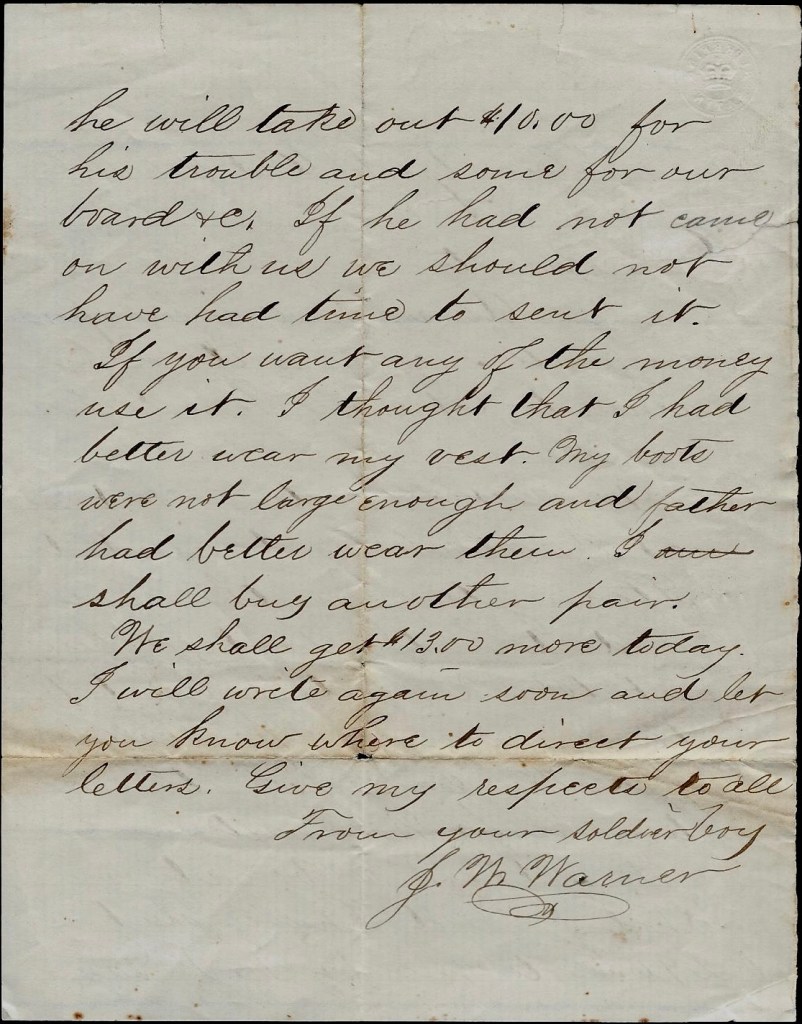 Regrettably there is no family tree information on this branch of the Guest family that I could find on-line. The letter was addressed to “Dear Father” but the envelope was addressed to James A. Guest who was born in Cattaraugus county, New York, in 1831 so he would be too young to be the author’s father. My hunch is that James was an older brother who had previously served in the Civil War in the 26th New York Battery and was, by May 1865, working as an express agent in Belle Plaine, Iowa, where he was enumerated in the 1870 census. Sometimes letters and envelopes get mixed up, or sometimes a letter from one child gets forwarded to another. James’ military records indicate that his parents were Henry Guest and Rachel Beadle of Seneca county, New York.