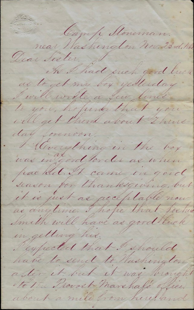 We are doing very heavy picket duty on this side of Washington. Orders are no persons are allowed to pass out or in with a pass [unless] signed by Gen. [Christopher C.] Augur or Secretary [Edwin] Stanton. It seems that Booth, the murder[er] is captured and his remains lie in state on board of a monitor [USS Montauk] in the Navy Yard at Washington. 1