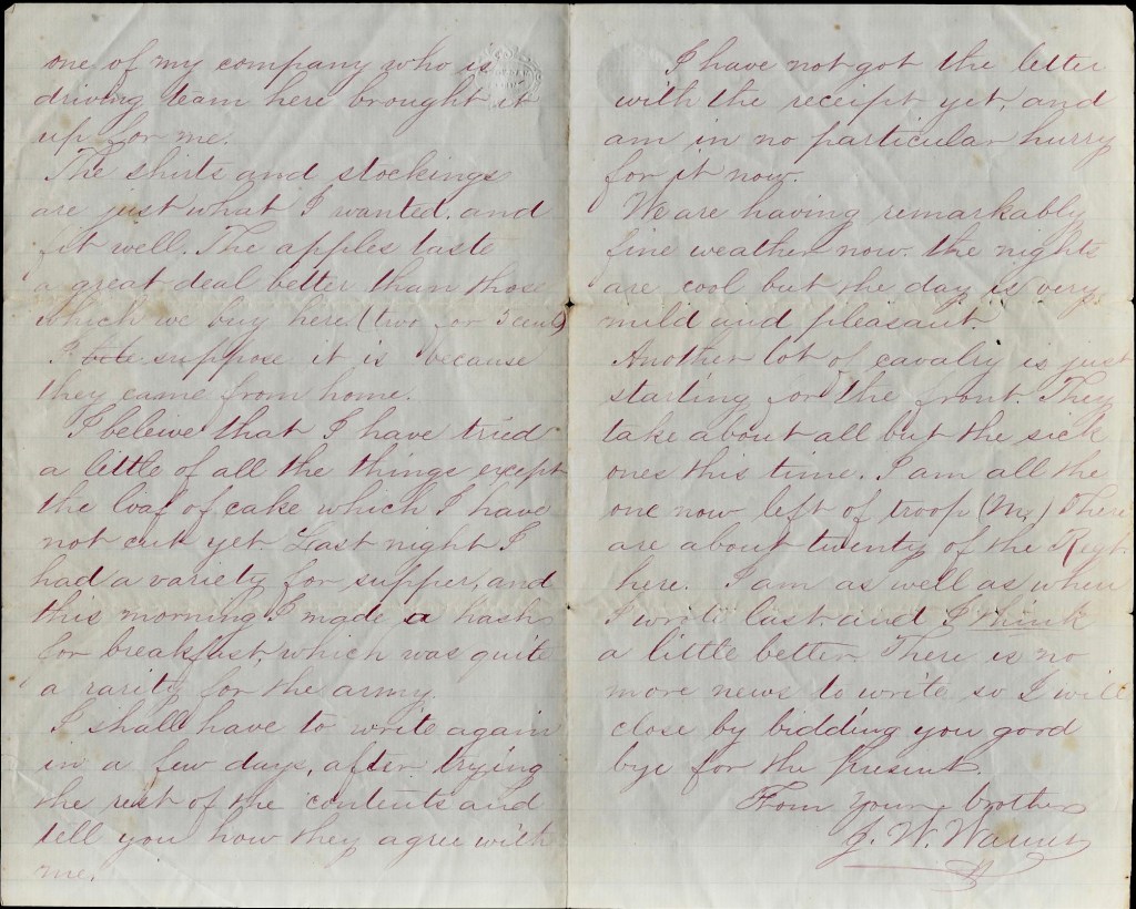 Your kind letter was received some time ago by Jimmie while we laid at Summit. The 4th of April we broke camp at Summit Point and went up the Valley above Winchester where the whole division assembled in a line of encampments. We remained there for four day and all of this time the cavalry was up in the Valley ahead of us scouring the Valley. They went up as far as Mount Jackson and only met with a few guerrillas and captured six of them which I had the chance of seeing as they passed along the pike, And at this time I had the chance of seeing the largest force of cavalry I ever witnessed including the 22nd New York and seeing some of the Lyons boys as they passed along in the column. I should think the column would extend in distance from one end to the other four miles distance including the whole line of them.