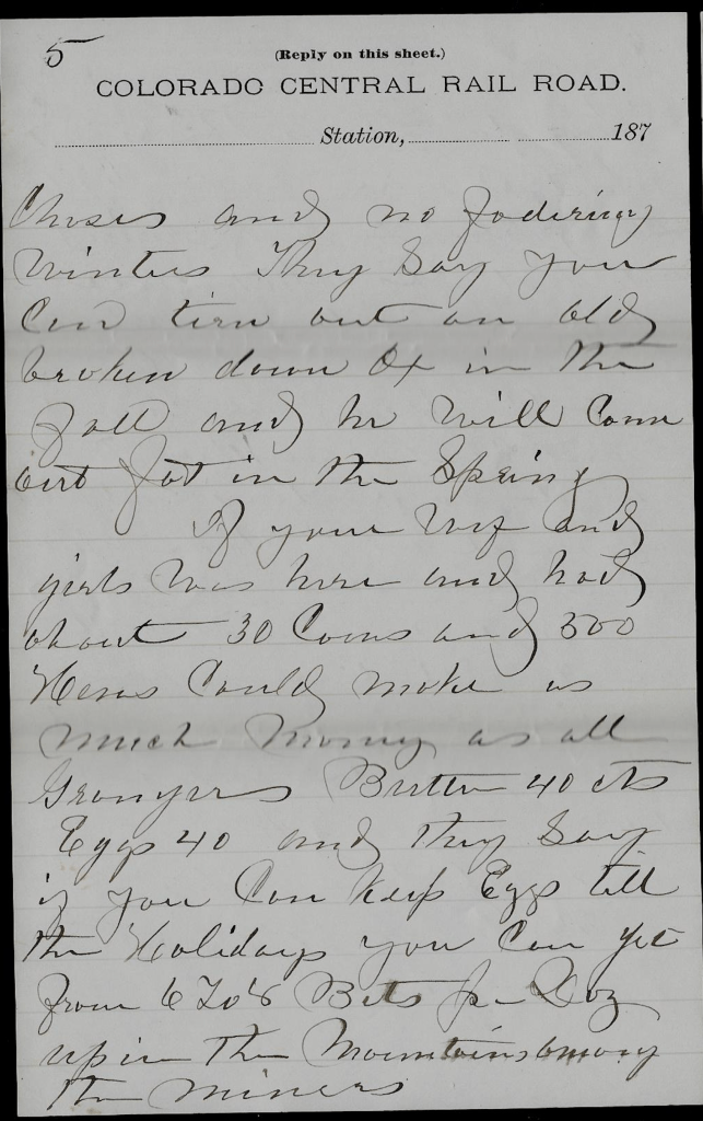 Tis said that delays are dangerous. I don’t know but it is dangerous to send this broken letter at this late hour. But I will render my excuses and venture to risk it. As you see, I had a letter commenced on the 3rd but was hindered in finishing it that day by company. So I thought I would finish it & send it by next mail, but was called off to engage in hunting up a horse thief & did not return until the day before yesterday. While one, I was at Denver which is as ever the “murderous city.” Last week there were eight men shot there of which two are dead. They have had considerable trouble there with the soldiers. A good many of my acquaintances have enlisted. One of the murderers now confined in the Denver jail awaiting his trial I am well acquainted with. I call him a murderer although he did not kill the man he shot—but it will go hard with him as the man he shot was a captain of the Home Guards there. He was one of the last whom I should have thought would have shot a man. But tis said that he was under the influence of liquor. Another lesson to those who are tempted to raise their pleasures and enjoyments or drown their sorrows by using the “sparkling wine.” Too many are the times in such cases that the pleasures induced in this way bring pain and sorrow upon the individual and all his friends. But still there are those who heed not the lesson. 1