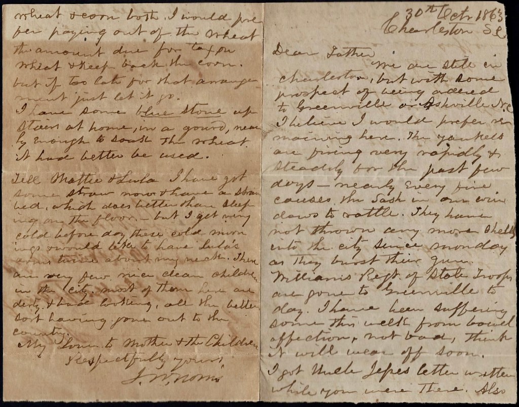 In this letter written to his father in October 1863, Sergeant Major J. W. Norris of the 1st South Carolina State Troops discusses Yankee artillery firing into Charleston, poor Confederate provisions, and his need for warm clothing as colder weather approached. Norris opens the letter stating “we are still in Charleston, but with some prospect of being ordered to Greenville or Asheville, N.C.” He continues, “the Yankees are firing very rapidly & steadily for the past few days.” Since August Federal artillery had been harassing the city from their Marsh Battery position near Morris Island-including the brief use of a massive 16,500 pound Parrott rifle nicknamed the “Swamp Angel.” Norris notes, however, that “they have not thrown any more shells into the city since Monday as they burst their gun.” The gun he refers to was not the Swamp Angel, which burst in August, but of another gun firing from the same position. Norris then mentions “Williams’s Regt. of State Troops are gone to Greenville today,” referring to Colonel James H. Williams’s 5th State Line Infantry. He also mentions that James L. Orr, Confederate Senator and organizer of Orr’s Rifles, “came down & went over to the Island yesterday.”