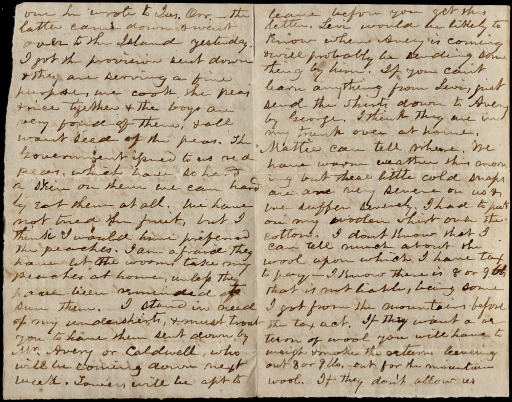 I got Uncle Jess’s letter written while you were there. Also one he wrote to James Orr. The latter came down & went over to the Island yesterday. I got the provision sent down & they are serving a fine purpose. We cook the peas & rice together & the boys are very find of them & all want seed of the peas. The government issued to us red peas which have so hard a skin on them we can hardly eat them at all. We have not tried the fruit but I think I would have preferred the peaches. I am afraid they have let the works take my peaches at home unless they have been reminded to save them.