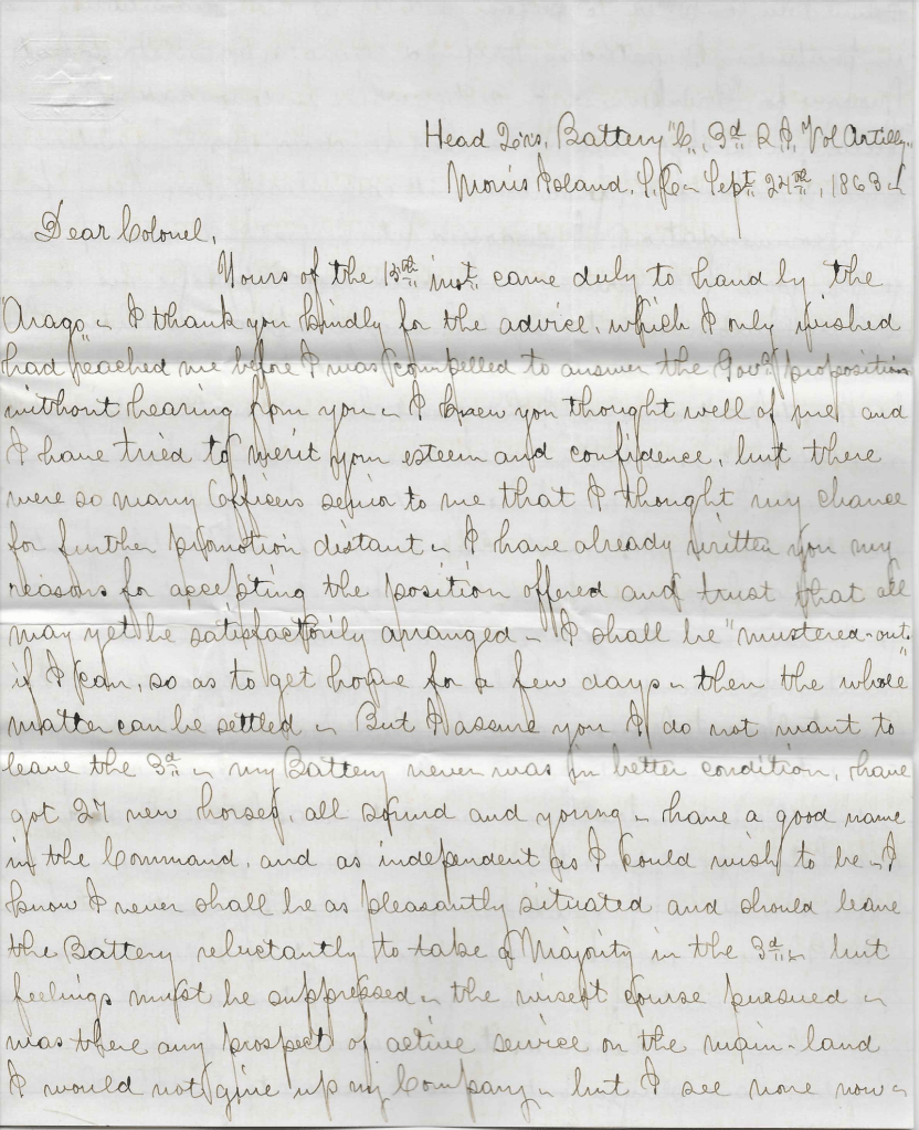 Yours of the 13th inst. came duly to hand by the Arago. I thank you kindly for the advice which I only wished had reached me before I was compelled to answer the Governor’s proposition without hearing from you. I knew you thought well of me and I have tried to merit your esteem and confidence, but there were so many officers senior to me that I thought my chance for further promotion distant. I have already written you my reasons for accepting the position offered and trust that all may yet be satisfactorily arranged. I shall be “mustered out” if I can so as to get home for a few days. Then the whole matter can be settled. But I assure you I do not want to leave the 3rd. My Battery never was in better condition. Have got 27 new horses, all sound and young, have a good name in the command, and as independent as I could wish to be. I know I never shall be as pleasantly situated and should leave the Battery reluctantly to take a Majority in the 3rd but feelings must be suppressed—the wisest course pursued. Was there any prospect of active service on the main land, I would not give up my company, but I see none now.
