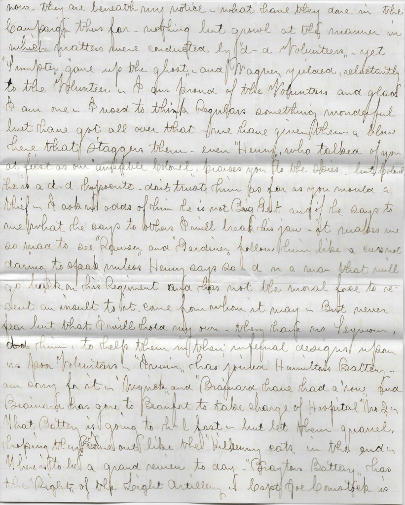 Regulars have “played out.” I don’t associate with them now. They are beneath my notice. What have they done in the campaign thus far—nothing but growl at the manner in which matters were conducted by “damned Volunteers,” yet “Sumter” gave up the ghost, and “Wagner” yielded reluctantly to the Volunteer. I am proud of the Volunteers and glad I am one. I sed to think Regulars something wonderful but have got all over that. We have given them a blow here that staggers them. Even Henry, who talked of you at first as our “amiable Colonel, praises you to the skies.” But Colonel, he is a damned hypocrite. Don’t trust him as far as you would a thief. I ask no odds of him. He is not Brig. Gen. and if he says to me what he says to others, I will break his jaw. It makes me so mad to see “Rawson” and “Gardiner” follow him like curs—not daring to speak unless Henry says so. Damn a man that will go back on his regiment and has not the moral force to resent an insult to it—come from whom it may. But never fear but that I will hold my own. They have no Seymour, damn him, to help them in their infernal designs upon us poor Volunteers.