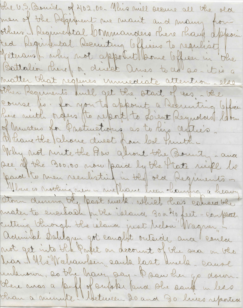 Reenlisting is all the rage here now. Connecticut offers a bounty to Veterans which with the US Bounty, makes $792 for cash, beside aid to the families. Rhode Island should offer $500 in addition to the US Bounty of $402. This will secure all the old men of the regiment we want and many from others. Regimental commanders here have appointed Regimental Recruiting Officers to reenlist Veterans. Why not appoint some officer in the Battalion here or direct Ames to do so? It is a matter that requires immediate attention—else other regiments will get the start of us. The course is for you to appoint a Recruiting Officer here with orders to report to Lieut. Reynolds, Com. of Musters for instructions as to his duties. I have the above direct from Col. Smith.