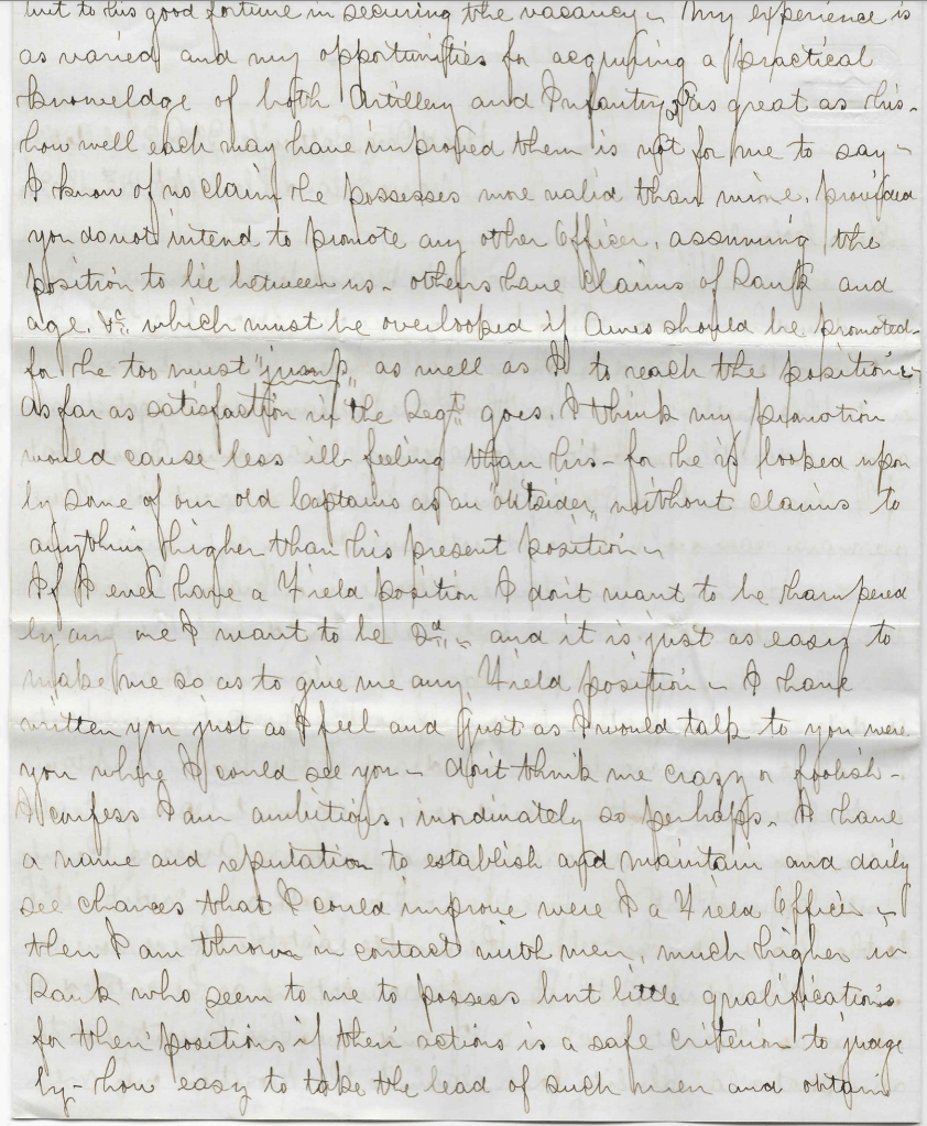 Ames is the only Field Officer that can fill the position with any credit, either to the regiment or himself. The simple fact that he is now my Senior should not, I think, weigh against me as he entered the service as 2nd Lieutenant and I as a 1st, and owes his seniority not to any particular ability for, or claim to, the position over me, but to his good fortune in securing the vacancy. My experience is varied and my opportunities for acquiring a practical knowledge of both artillery and infantry are as great as his. How well each may have improved them is not for me to say. I know of no claim he possesses more valid than mine, provided you do not intend to promote any other officer, assuming the position to lie between us. Other have claims of rank and age, &c., which must be overlooked if Ames should be promoted for he too must “jump” as well as I to reach the position.